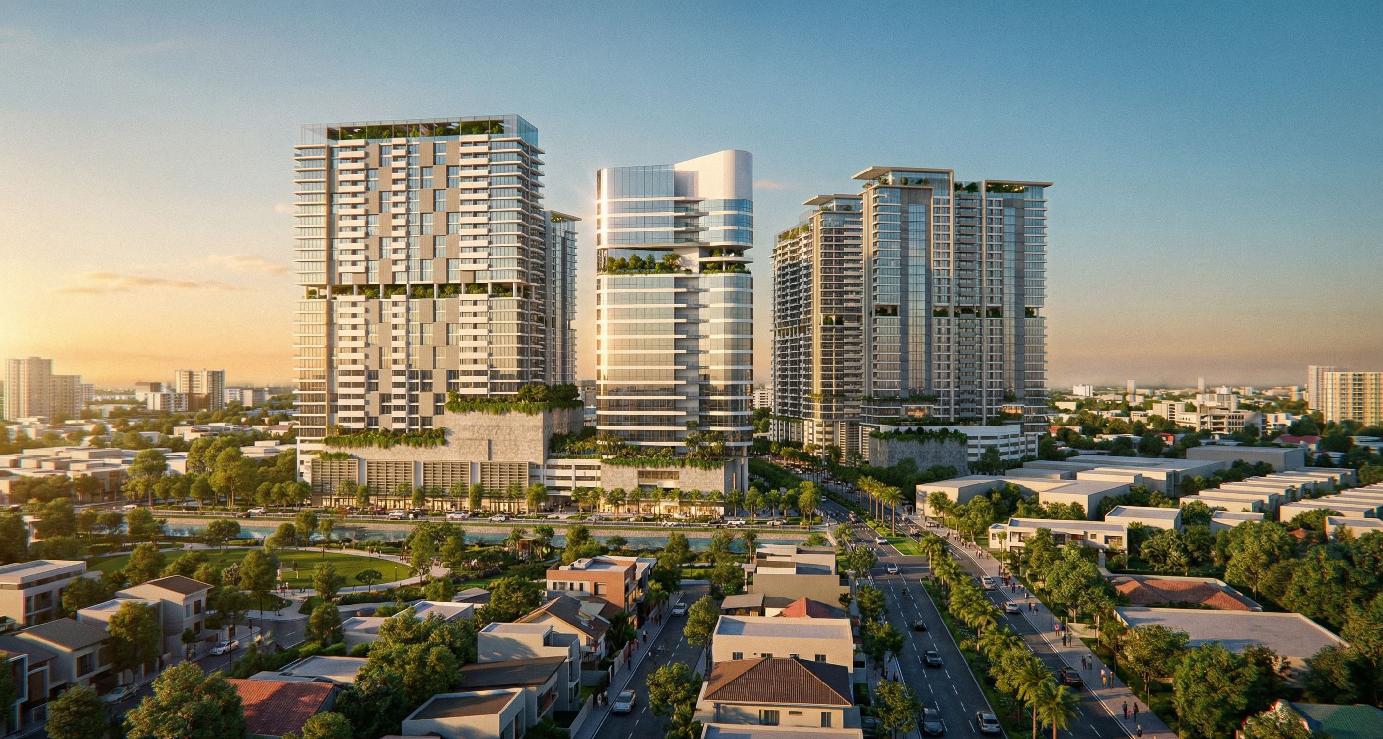 PromptPhoto of a modern high-rise residential complex featuring sleek facades of glass and concrete, adorned with green terraces. The urban setting includes surrounding low-rise buildings and tree-lined streets, creating a vibrant neighborhood. Natural daylight illuminates the structures, casting dynamic shadows. Captured from an aerial perspective, emphasizing the layout of the complex and its integration with the landscape, utilizing a wide-angle lens to showcase the expanse of the environment. The scene conveys a harmonious blend of architecture and nature, highlighting the innovative design elements., keep exact camera angle