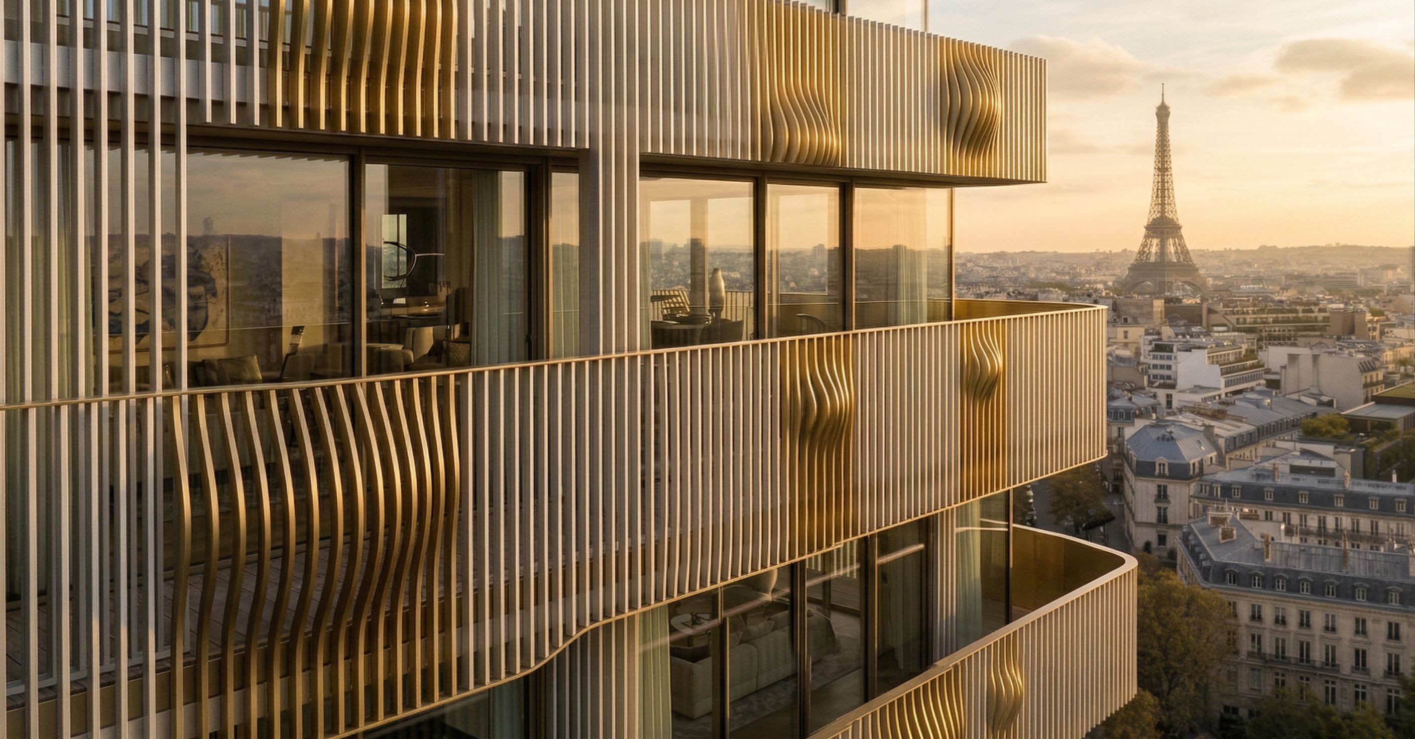 crea un'immagine altamente fotorealistica e ad alta risoluzione. Modifica "solo" i parapetti di questa immagine e sostituiscili con elementi di metallo molto più sottili e di spessore inferiore a quello mostrato nell'immagine; le dimensioni degli elementi verticali e di quelli sagomati nell'immagine base, deve essere circa la metà di quella visibile. La dimensione dei profili in sezione deve essere cm 2,0 x 4,0.