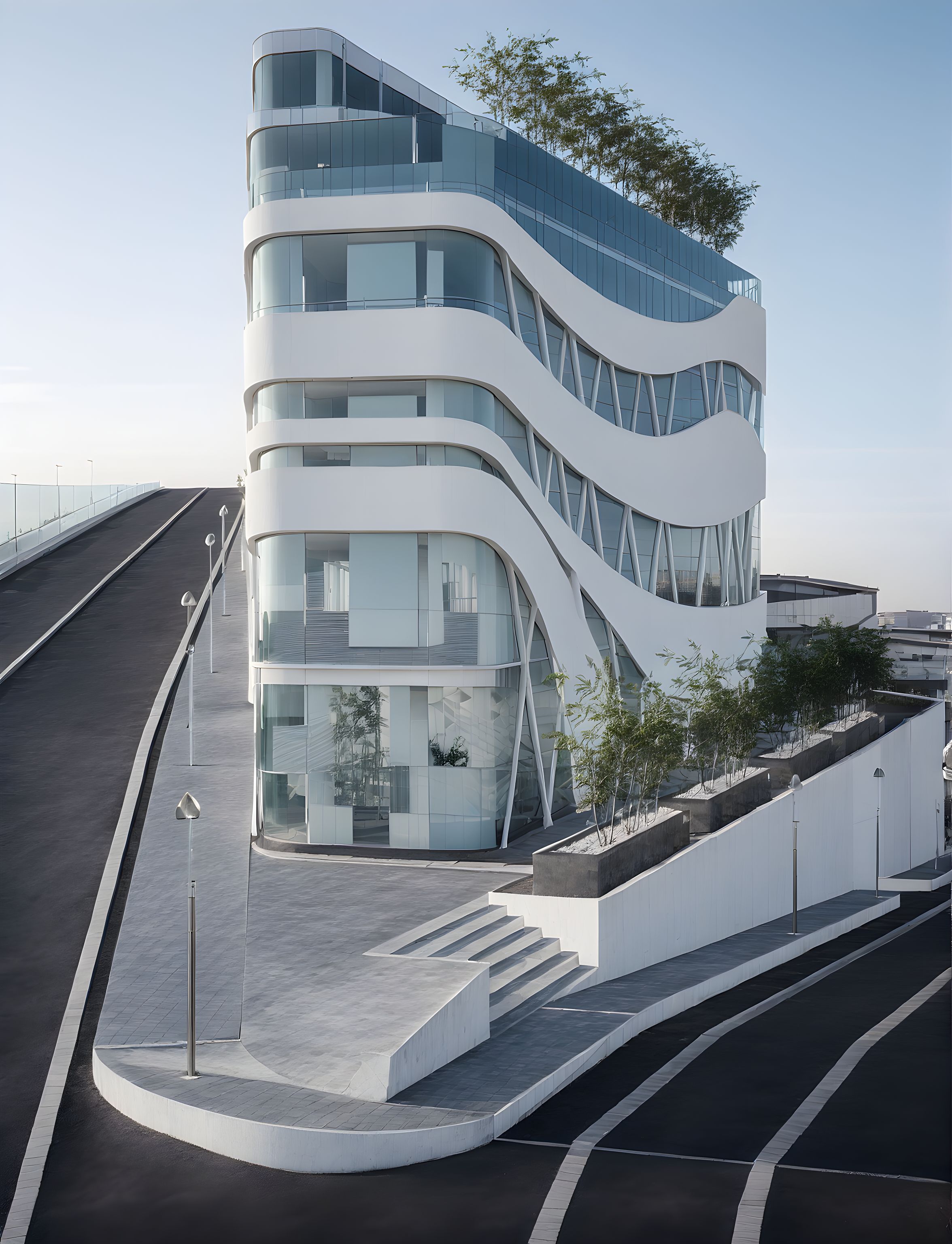 commercial building in a cross road. white concrete facades in the shape of waves, clean glass facade and some stainless steel tubes. clear sky