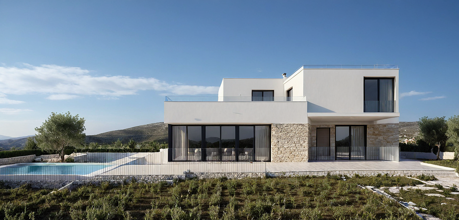 Single family house in greece, minimalistic aproach, exterior rendering. Blue sky. Terrace with screed. Olive trees in the garden around the terrace. Glazing with black framing. Walls white and partly with beige stone cladding.
