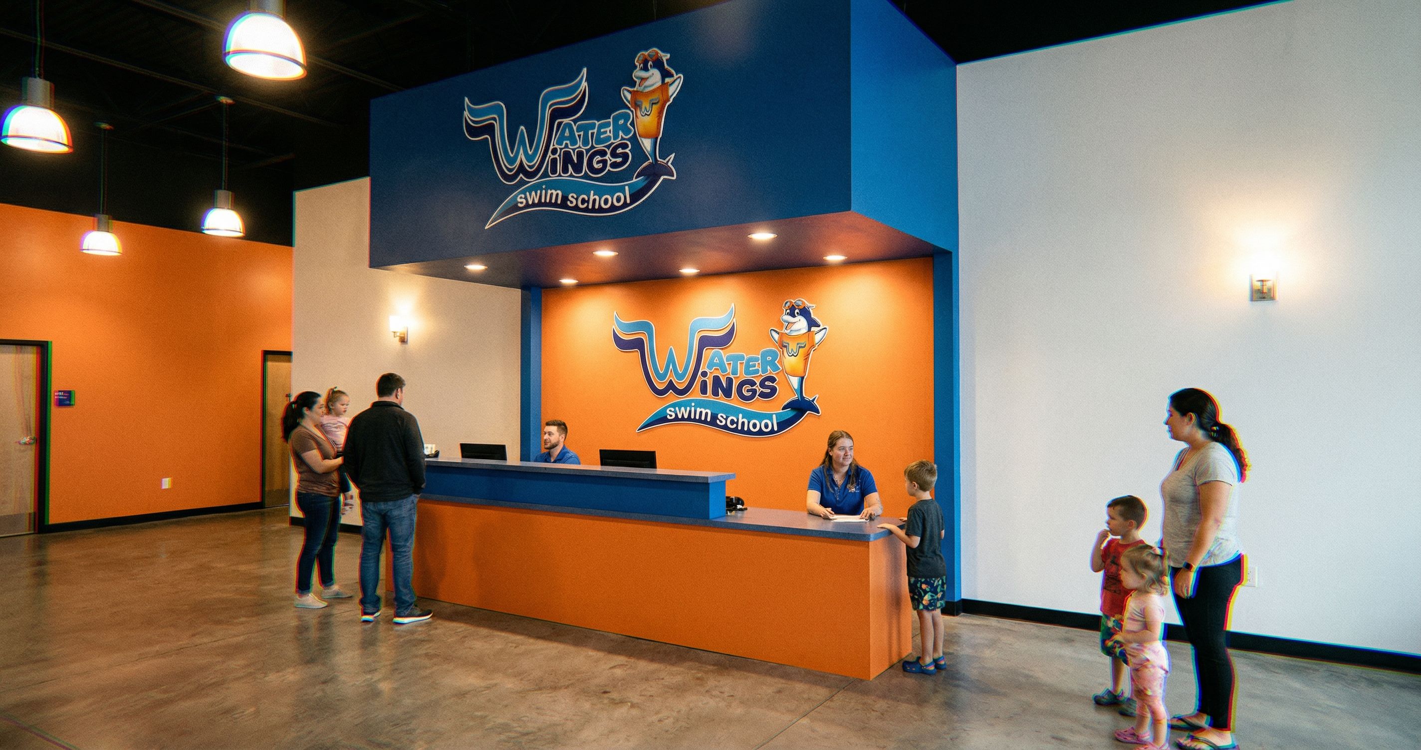 PromptThisis the water wings swim school reception desk up against the tenant deimising wall. Please logo on back wal land soffit up aobve. There is down lighting in the sofft. Use reference image., keep exact camera angle