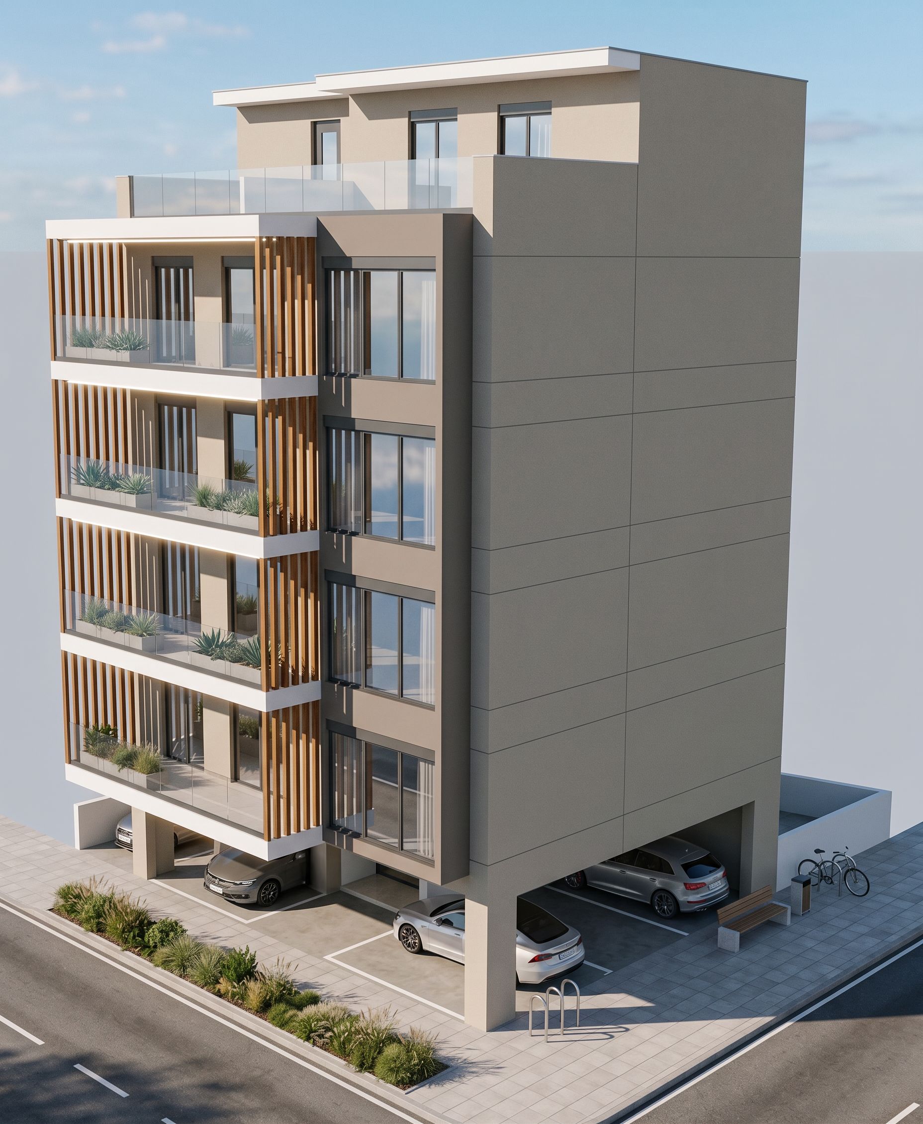 PromptPhoto of a modern apartment building featuring sleek lines and contemporary balconies. Emphasize , expansive glass windows, and wooden tops of balcony accents. Capture natural sunlight enhancing the architectural details, with soft shadows cast by the balconies. Basic color ral 7006 and some beige details with white balconies. Dont change the building. No trees .Do not add environment with building, only sky and road. white Grammical Light in the wooden balcony, keep exact camera angle dont change the ground floor beacuse it is open parking area, keep exact camera angle