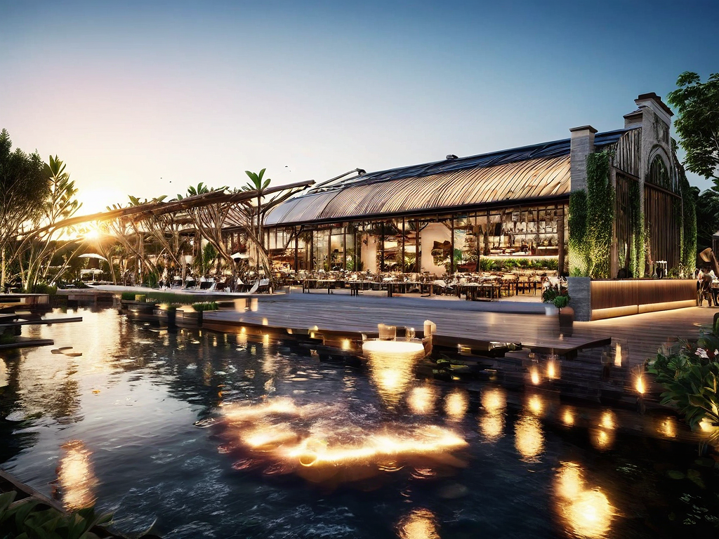 food hall, amazing garden, same construction materials, same facade style, amazing terrace, lifestyle, sunset, uranus god, mythology