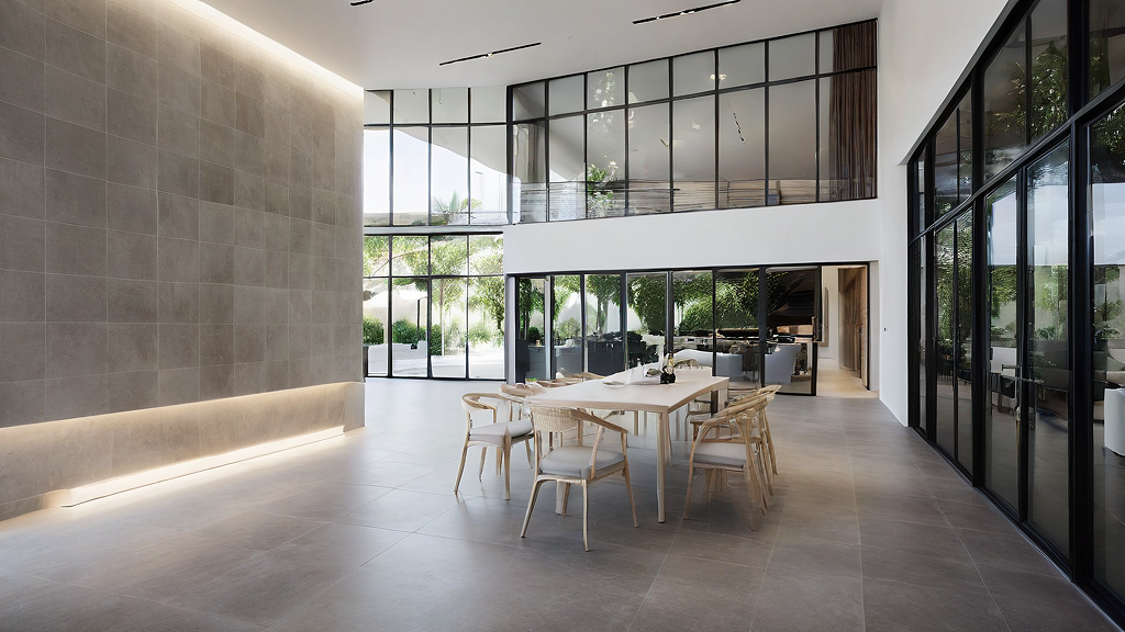 PromptNatural light, interior lighting, table, chairs, seating, plaster, white walls, trim, grey tile, glass