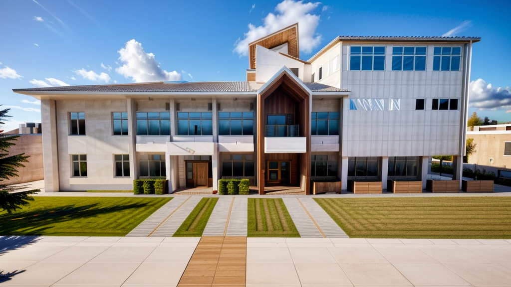 Promptcity hall building, white decorative plaster facade, use of wood, and grass in front of the building