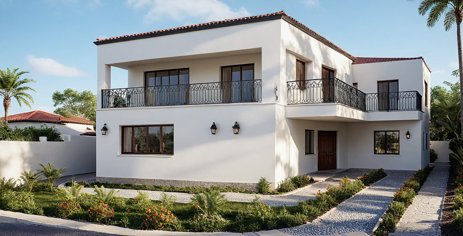 Prompt"A high-quality 3D render of a Spanish-style bungalow viewed from the road. The bungalow features a high sloping terracotta-tiled roof, white stucco walls, and an ornate Spanish facade with arched windows, decorative wrought iron railings, and wooden beam accents. The entrance gate is grand, made of intricate wrought iron, opening to a beautifully landscaped front yard with lush greenery, colorful flowers, and a stone pathway leading to the main entrance. The roadside landscape includes palm trees, decorative street lamps, and a charming Mediterranean ambiance. The architectural design blends traditional Spanish aesthetics with a warm and inviting atmosphere."