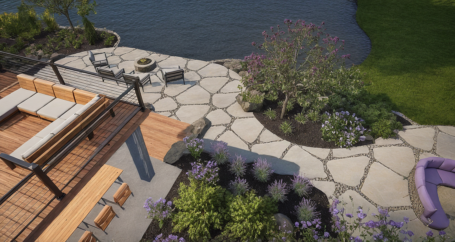 Promptlandscaping, teak siding, lawn, flagstone patio, mulch, concrete driveway, lawn furniture, junipers, river birch, lilac, asters