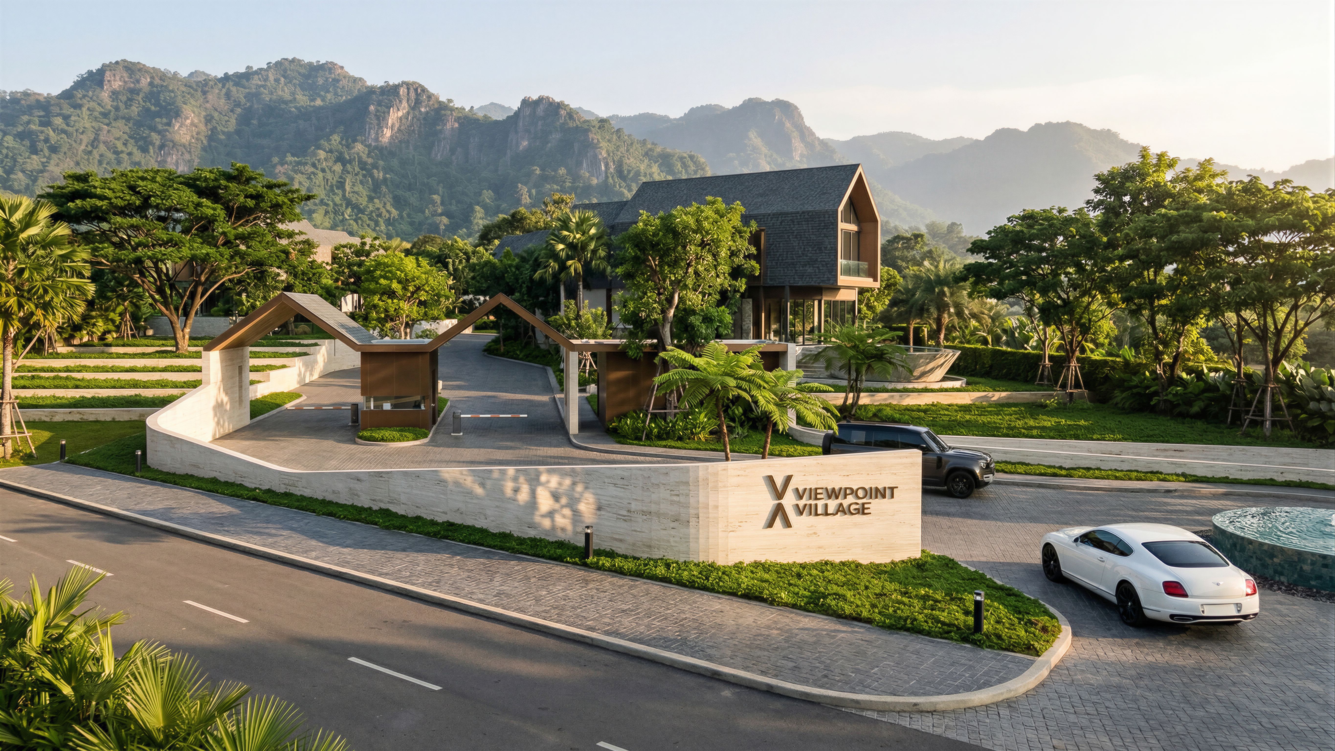 PromptA photorealistic architectural rendering of an ultra-luxury village entrance gateway and signage located in Khao Yai, Thailand. The design follows the composition and perspective of the reference image, featuring a Minimal luxury style. The gateway structure is defined by striking White Travertine stone walls and rich Bronze metal accents. Raking morning sunlight grazes across the wall surfaces, casting beautiful, intricate dappled shadows of trees onto the curved stone façade. The project name and logo, made of Bronze, are elegantly mounted on the entrance wall. The gateway features a prominent gable-shaped roof with dark gray asphalt shingle roofing. The upper mass of the houses featured white travertine wall and dark gray asphalt shingle roof. The surrounding environment is lush and shady, filled with large mature trees and diverse tropical flora, with leaves glistening in the morning light. A scenic view of the surrounding Khao Yai mountain ranges forms the background. High-resolution, cinematic lighting, incredibly detailed., keep exact camera angle, keep exact camera angle