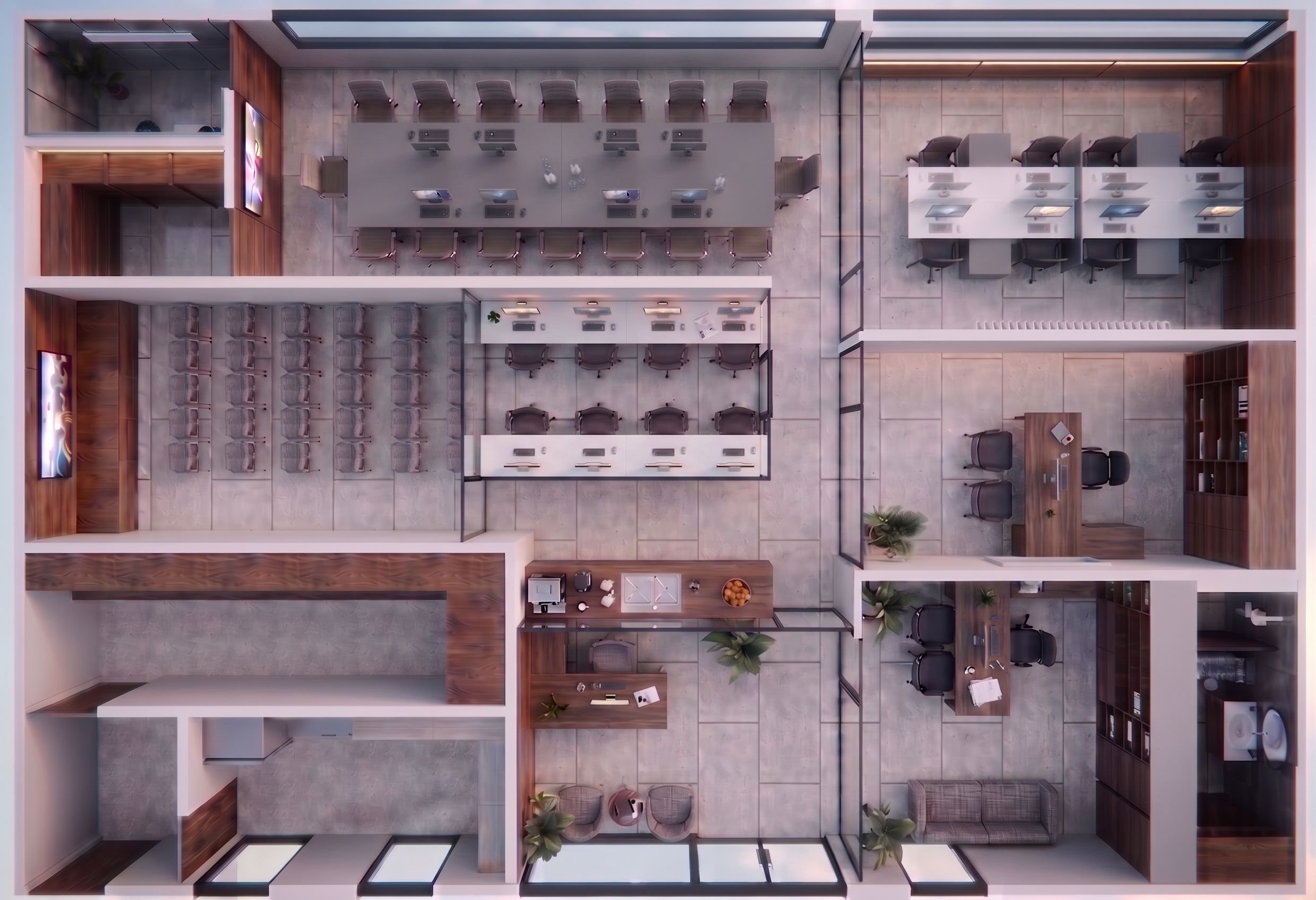 PromptPuedes cambiar a color blanco los 8 escritorios de la oficina que está en todo el medio no modifiques más nada , keep exact camera angle