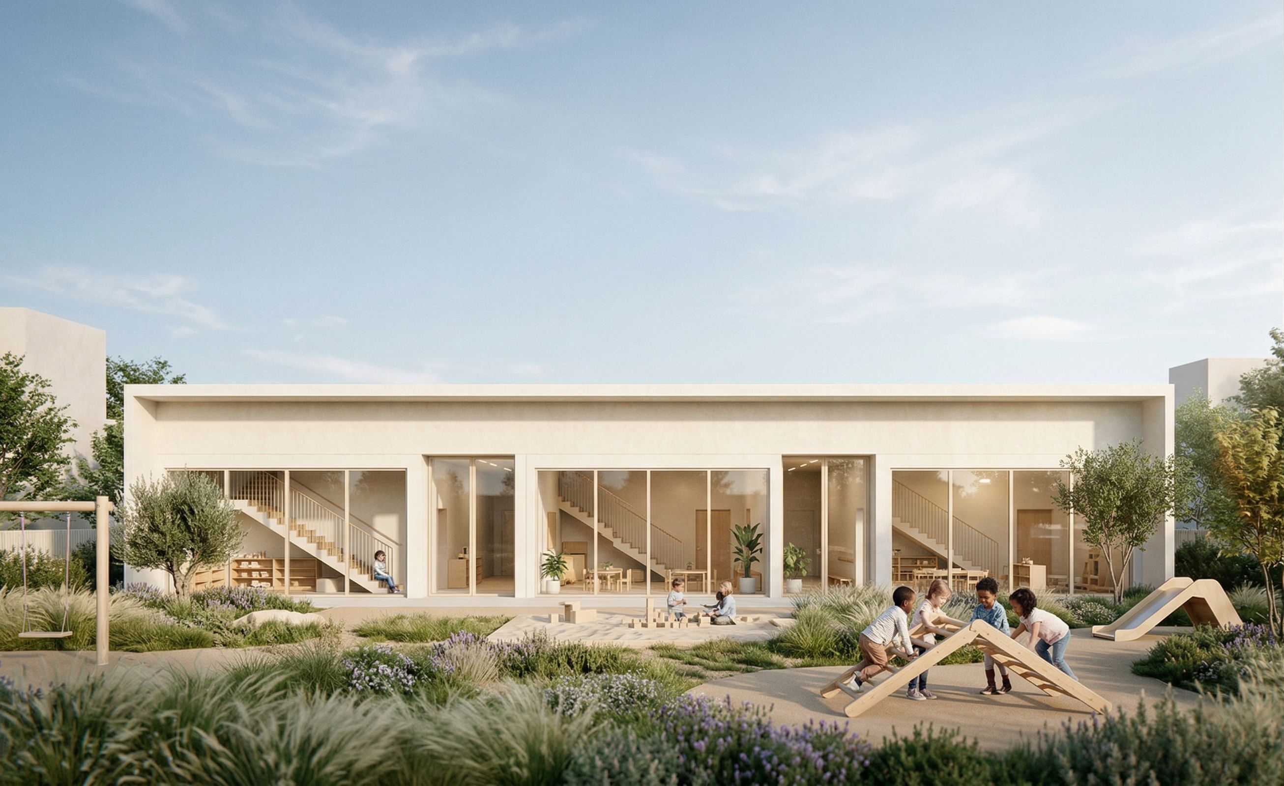 Promptthis building is a kindergarden, please, add children, playground, nice greenery. Materials should be light, pleasent, colour sheme calm and pleasent. , keep exact camera angle