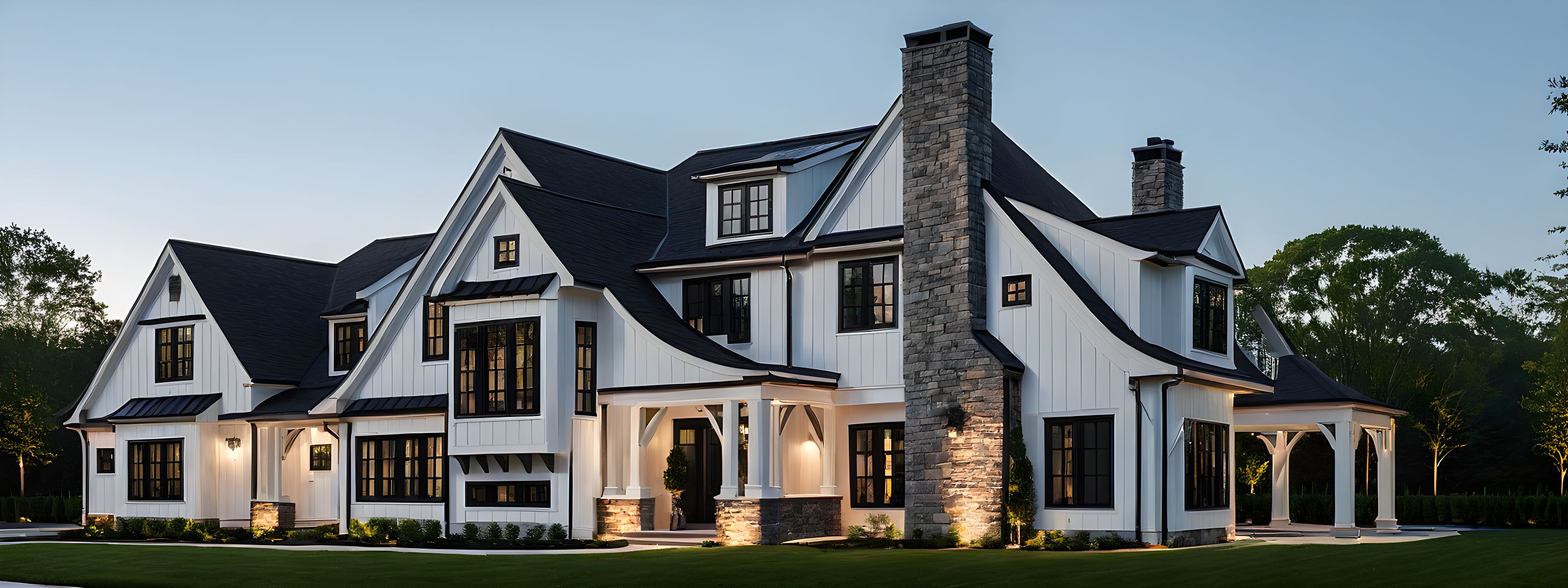 white wood shingle siding black roof lush lawn and landscaping Belgian block stone fireplace driveway white trim and columns cherry tree in lawn white brackets white windows night view lights on large trees in background pool foreground white railing steps turn all lights in windows lots of small shrub flowers