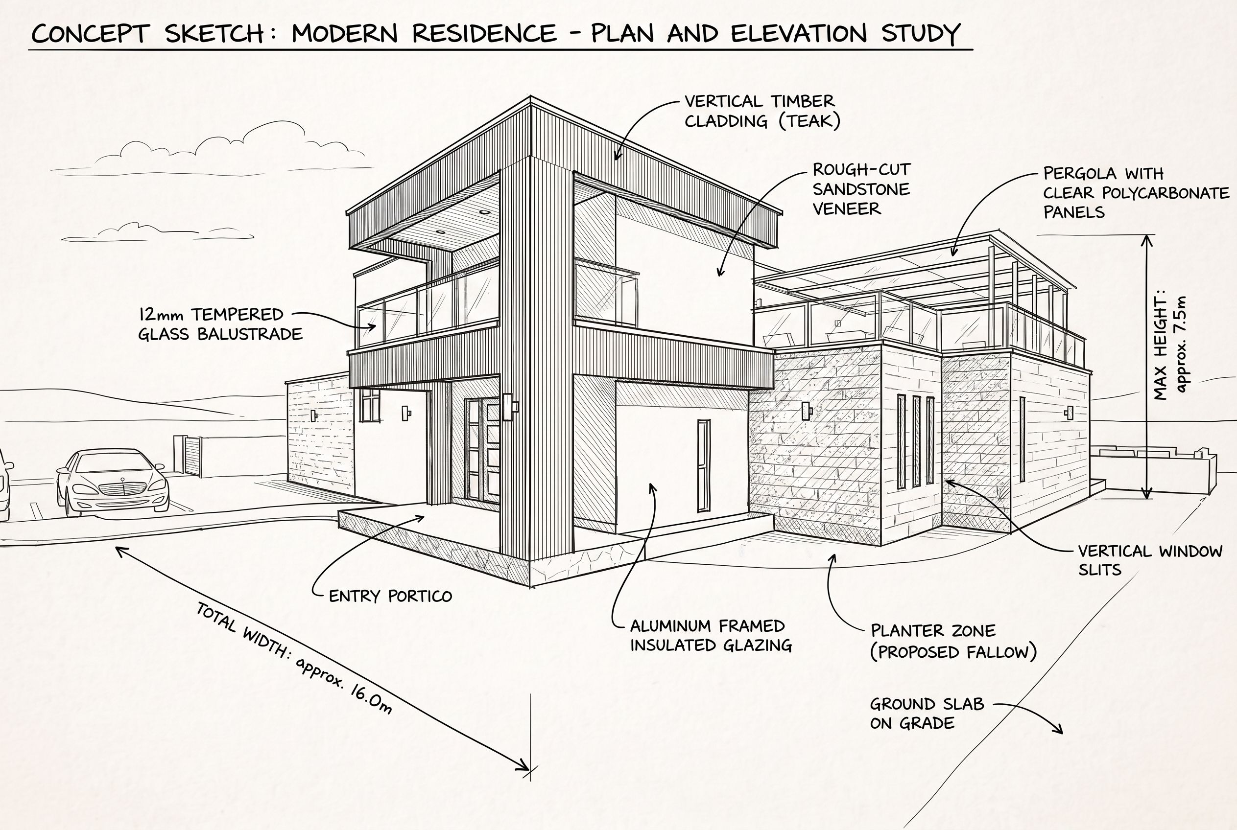 PromptTurn this render into a black and white sketch with annotations and without plants and no annotations for cars, keep exact camera angle