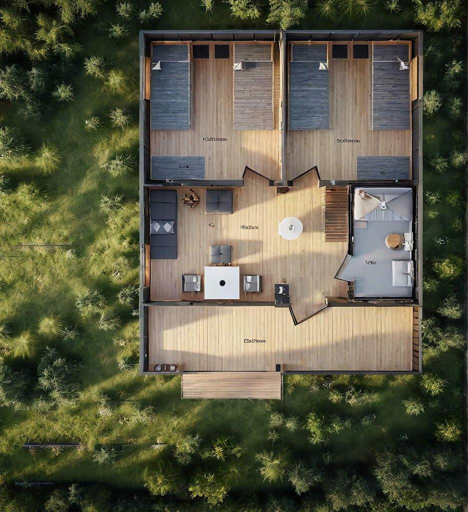 Top view the interior of a Scandinavian-style country house. Barnhouse with a terrace below. The kitchen-living room is large and there are two bedrooms. There is grass and trees with a road around.