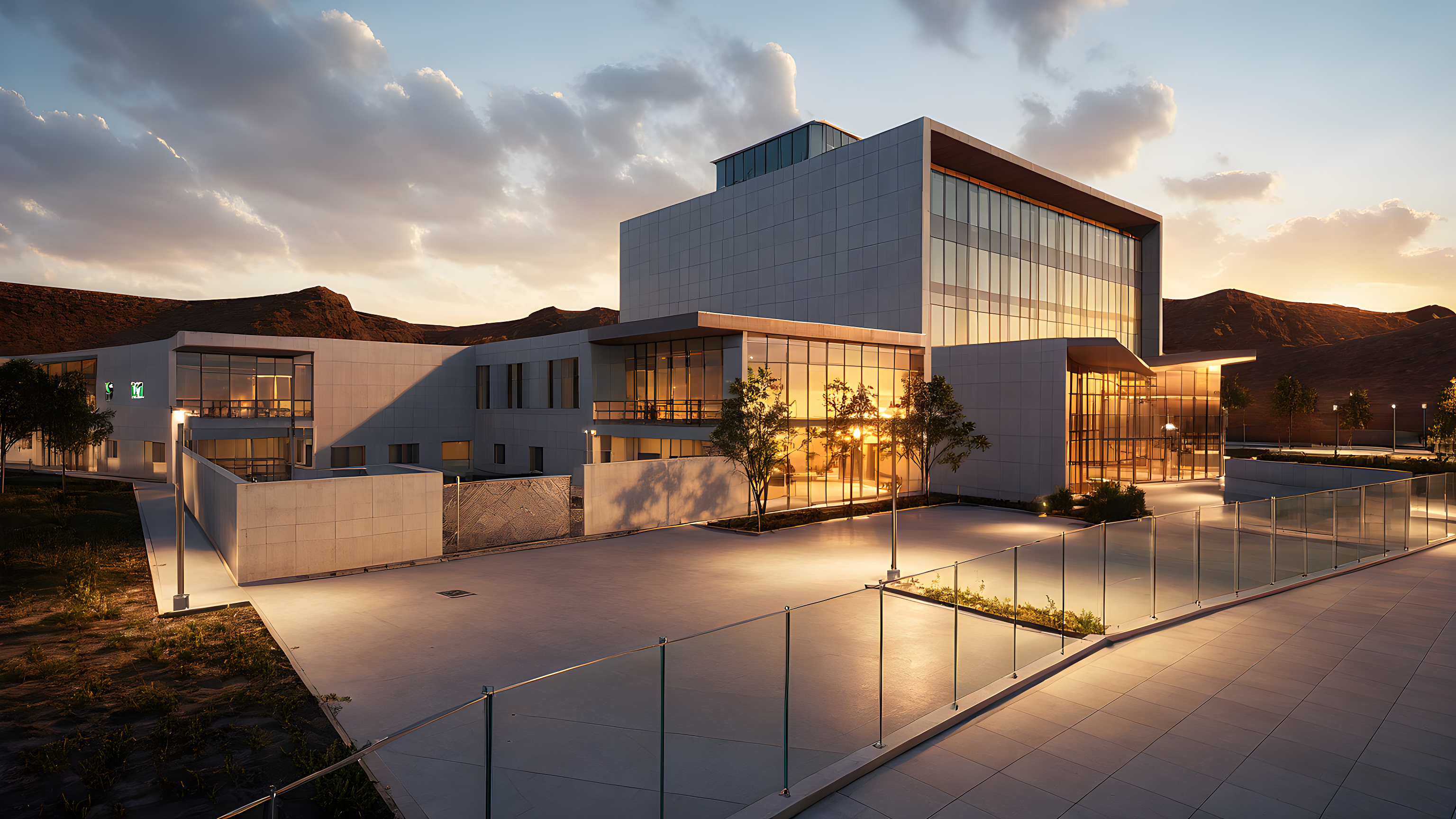 Promptsunset, warm, seats, modern hospital, entourage, concrete stone, clear glass, metal panels.