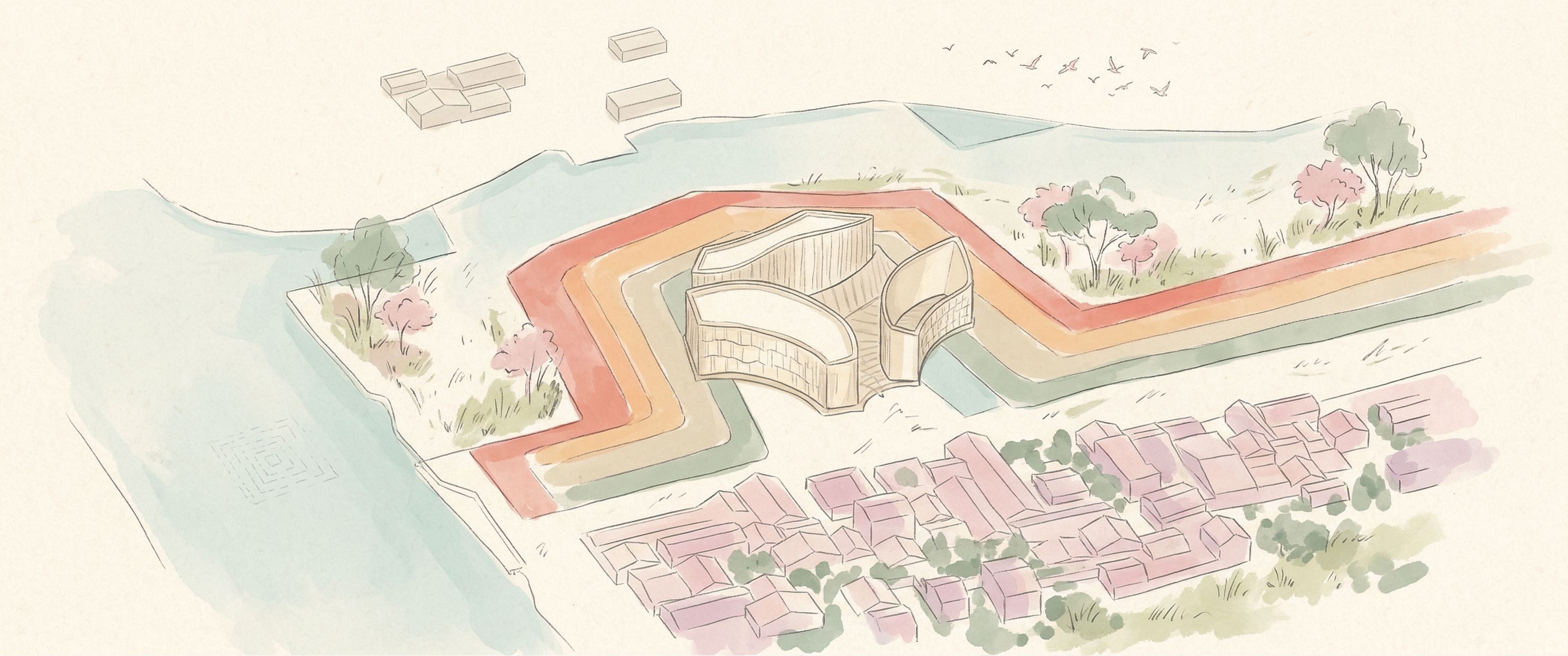Transform this Rhino massing/site model into a soft hand-drawn architectural landscape illustration inspired by a vintage storybook / mid-century nature print aesthetic. Keep the exact geometry, camera angle, site layout, building placement, topography, and circulation lines from the original model, but reinterpret everything as a loose, expressive drawing rather than a 3D rendering. Style the image like a delicate ink-and-pastel drawing with: soft watercolor washes muted pastel greens, blush pinks, pale beige, dusty sage, faded coral, and warm cream tones thin, sketchy linework with slight irregularity minimal shading a flat, atmospheric composition subtle paper texture gentle layered vegetation drawn in an impressionistic way light, whimsical landscape details The building forms should read clearly but be simplified into an illustrated architectural composition, with curved walls and masses expressed through soft outlines and light tonal fills instead of realistic materials. Avoid photorealism entirely. The site edges, pathways, water, and land bands should become graphic, painterly layers with softened boundaries and harmonious colors. The surrounding context should feel like an illustrated ecological setting: abstracted trees and planting soft grassy textures light expressive marks for landscape movement possible birds or subtle animated natural elements in the sky for atmosphere simplified water with pale blue-green tonal washes Overall mood: calm, poetic, airy, nostalgic, ecological, hand-crafted, architectural but artistic. Important constraints: Do not change the geometry Do not redesign the building Do not alter the site organization Do not make it photorealistic Do not add modern rendering effects Do not use hard shadows, glossy materials, or realistic textures Preserve the Rhino view exactly, only restyle it as a soft illustrated drawing, keep exact camera angle