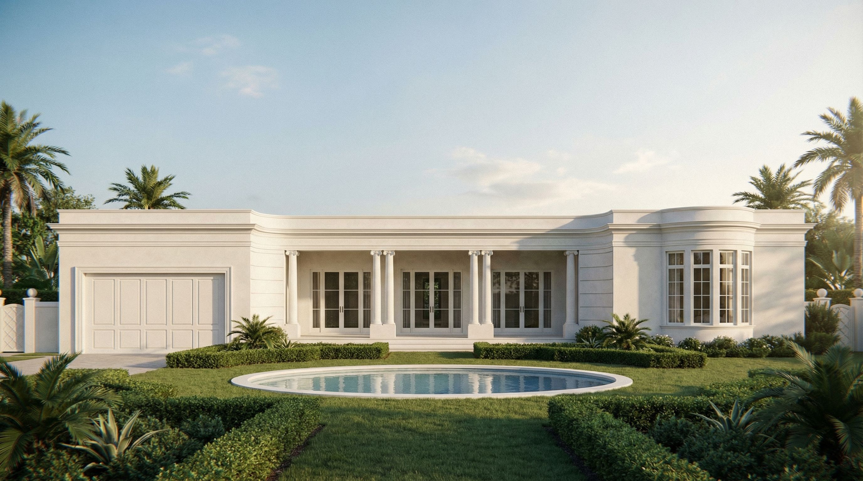 PromptUltra-photorealistic rendering of a Neo-Classical Regency Palm Beach residence (rear façade) using the provided elevation as a fixed, scaled architectural blueprint. CRITICAL — ABSOLUTE CONSTRAINTS: The elevation drawing defines exact proportions, geometry, and relationships. All widths, heights, alignments, and spacing must match the drawing precisely. Do not approximate proportions. Do not stretch, compress, or rebalance the composition. Do not add, remove, or reinterpret any architectural elements. MASSING AND DEPTH (NON-NEGOTIABLE): Maintain the exact depth hierarchy shown in the drawing: Central loggia is the furthest back element Doors within the loggia are recessed further behind the columns The two flanking wings (garage and bedroom wing) sit forward and align with each other These offsets must be clearly visible and not flattened or exaggerated. CURVED WALLS (CRITICAL): The wall sections adjacent to the loggia with horizontal line detailing are true curved (concave) surfaces. They must read clearly as curved transitions between the loggia and the wings. Do not render them as straight or planar. Their curvature and proportions must match the drawing exactly. PROPORTIONS + STYLE: Follow strict Neo-Classical Regency proportions—low, horizontal, refined, and restrained. All openings, columns, bays, and wall divisions must match the elevation exactly. No enlargement of windows, no widening of doors, no thickening of columns. BEDROOM WING: Include a semi-circular Regency-style bay window with historically accurate proportions—elegant, shallow, and not oversized. BAY WINDOW PROPORTIONS (REGENCY ACCURATE — CRITICAL): The bay window must be subordinate to the main composition and proportionally integrated with the wing. The projection should be moderate and refined, not deep or dominant The radius of the bay should be tight and elegant, not wide or bulky The width of the bay should be clearly smaller than the width of the wing it sits on The height must align exactly with the main façade datums (base, window head, and entablature) The bay should feel like a refined extension of the wall, not a separate tower or feature element The curvature must be smooth and continuous, forming a true semi-circular plan, with windows arranged proportionally along the curve. Overall reading: The bay window should feel balanced, light, and classically restrained, enhancing the façade rather than competing with the central loggia. LOGGIA: Column spacing, height, and depth must match the drawing exactly. Doors behind are recessed and aligned precisely with the elevation. POOL (SUBORDINATE ELEMENT): Centered on the loggia axis. Oval shape with the long side parallel to the façade and visible in view. Keep scale modest—do not let the pool dominate or distort the architectural proportions. MATERIALS: All-white palette. Limewashed stucco with subtle texture. Refined, crisp classical detailing with minimal contrast. LANDSCAPE: Palm Beach garden—symmetrical, controlled, elegant. Low hedges, soft lawn, restrained tropical planting. LIGHTING: Soft warm afternoon light evenly illuminating the rear façade. Shadows should help reveal depth and curvature. CAMERA: Slightly elevated 3/4 rear perspective. 35mm lens. Framed to clearly show proportional relationships and depth offsets. REALISM: Highly photorealistic, subtle imperfections, soft reflections, refined atmosphere. NEGATIVE CONSTRAINTS: no proportion changes, no stretched geometry, no flattened depth, no straightening curved walls, no oversized pool, no added elements, no modern reinterpretation, keep exact camera angle