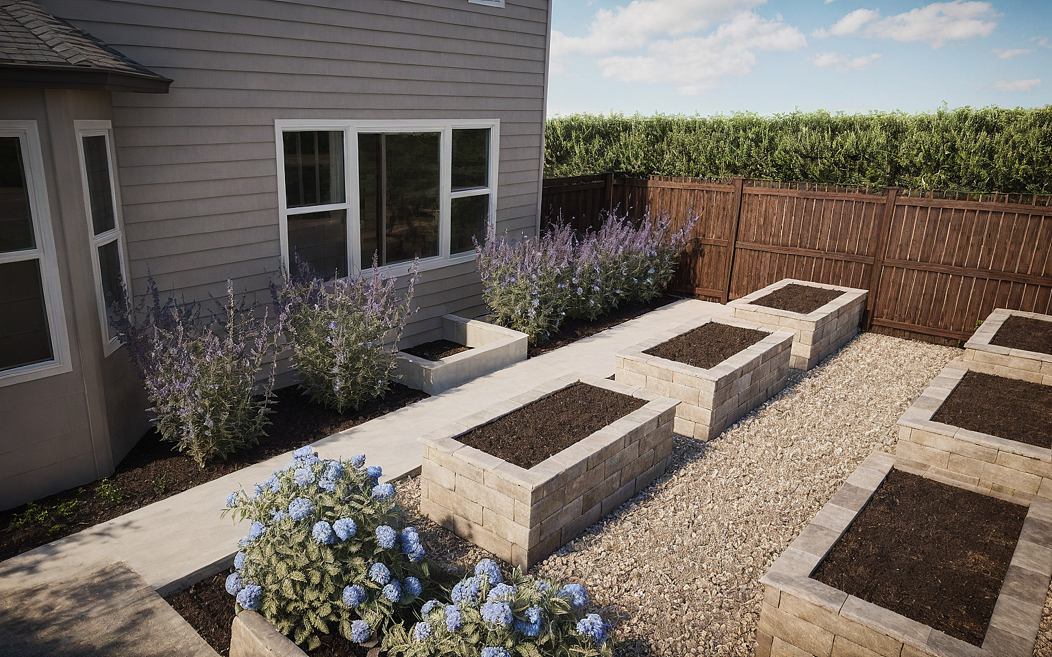 Enhance, tan house, russian sage, hydrangea, brown fence