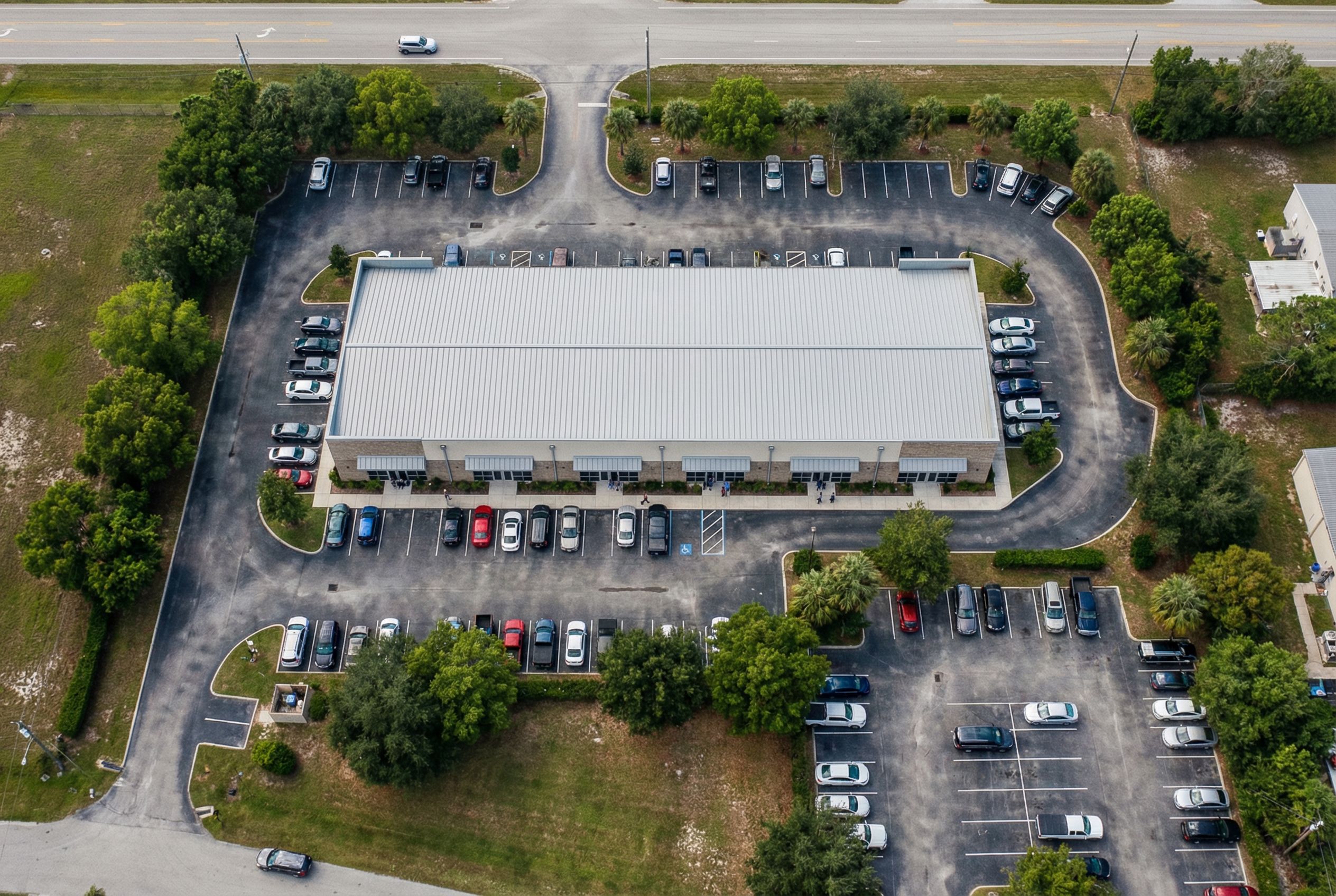 One Pre-Engineered Steel Building Consisting of 18,200 Square Feet 	24’ Eave Height Plus Parapet Height 	Standing Seam Metal Roof 	6 Each Storefront Glass Entrances w/ Impact Rated Glass 	290 Linear Feet 5’ Awning 	6 Each Personnel Walk-Doors 	2,400 Square Feet Impact Rated Storefront Glass 	16,000 Square Feet of Masonry , keep exact camera angle