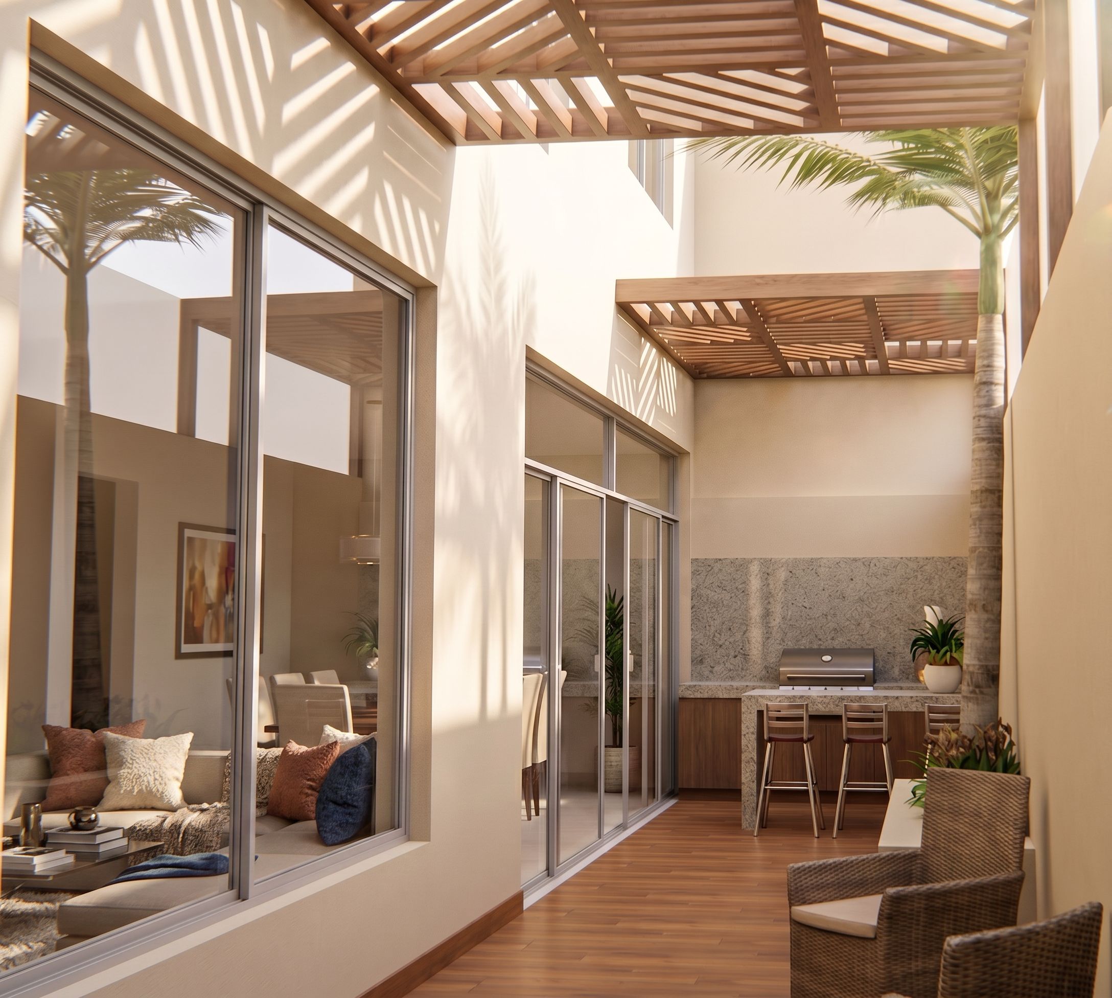 PromptPhoto of a contemporary outdoor living space with large glass sliding doors, wooden flooring, and a woven chair. The architectural design features sleek lines and a dark gray metal structure with a modern roof, enclosed by tall walls around it, light sand-colored, a bar with a gray granite countertop, and in the background a back bar with a grill and a back wall finished with gray granite at medium height. Natural light floods the space, casting soft shadows across the patio. Captured from a low-angle perspective, highlighting the interaction of elements and textures, showing the cozy atmosphere. Wood-look flooring, on the left side in the interior at the back there is a dining area, and on the left side in the interior in the front there is a sunken living room.