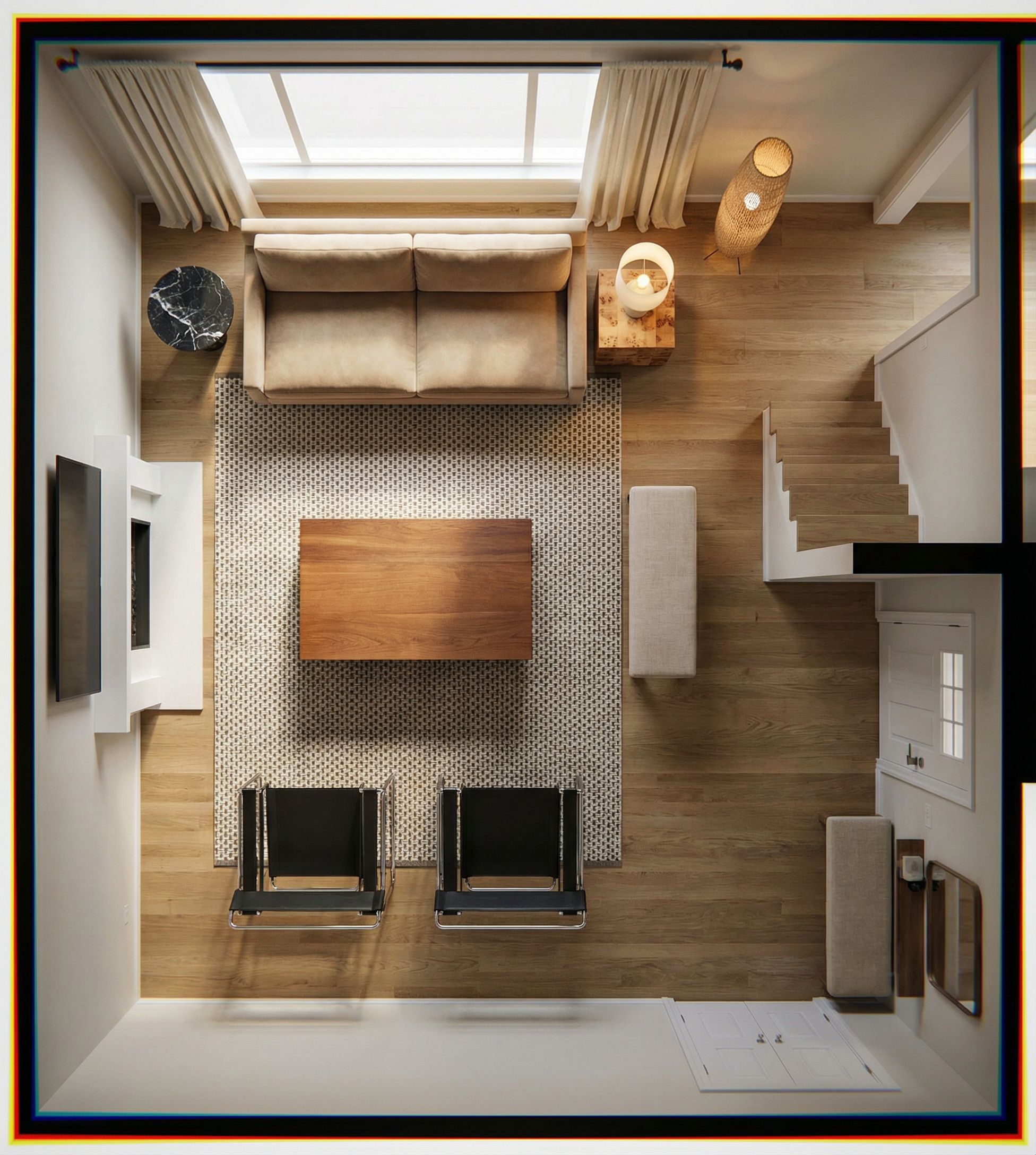 Promptuse the uploaded image floor plan and render it to look realistic using the furnshings in the reference image. two wassily black and chrome chairs opposite the beige velvet sofa. wood coffee table in middle. burl square end table with table lamp on one side with round black and white table on the other side. the rattan floor lamp goes in the corner near the chairs. what i dont show is a wall mounted shelf and mirror beside the entry door. also a linen simple bench before you enter the living room - shown as a rectangle on the plan. Draw this as a side split style home with a large 96" wide picture window with cream linen drapery on each side. there are double closet doors behinf the entry door and 4 stairs going up to the next level. there is a door opening to the kitchen as well. show this plan with mid tone white oak flooring. there is a white paionted fireplace on the end of the room with a tv above. render this as a floor plan or aerial view perpective.