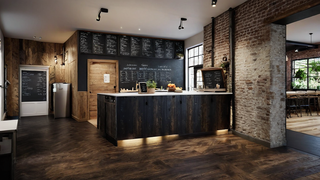 PromptIndustrial style. modern but rustic, chalkboard menu on the top, dark color door, wood floor, simple, bright and warm