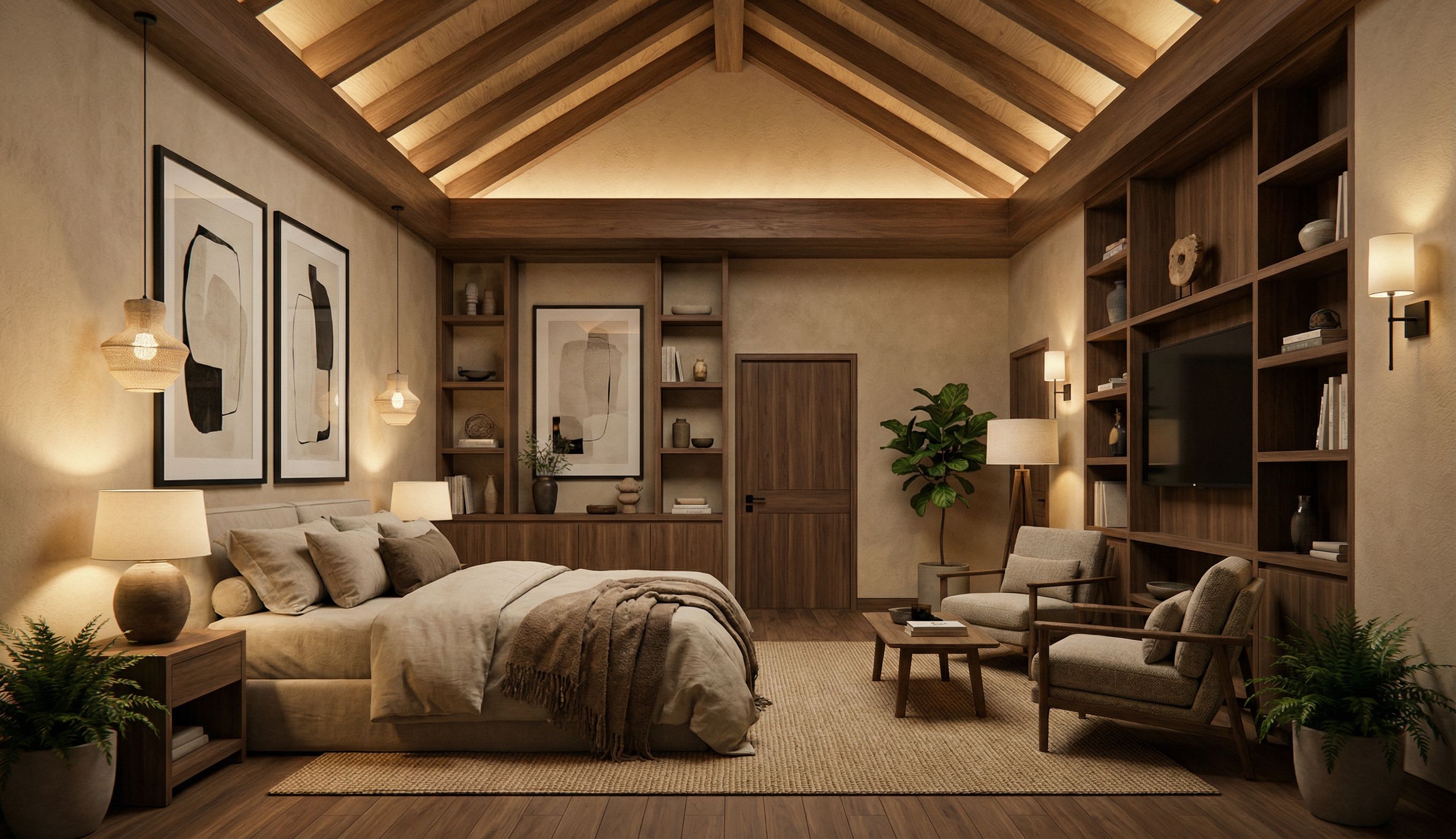 PromptHigh-end photorealistic architectural rendering of a luxury boutique hotel lounge inspired by the serene minimalism of Aman Resorts and the warm rustic elegance of Restoration Hardware. Double-height living space with a gabled roof, exposed beams, and plywood ceiling finished in matte walnut. WOOD-LOOK FLOORING IN MATTE WALNUT COLOR, with a large natural sisal rug anchoring the seating area. BED WITH COMFORTABLE MATTRESS COVERED WITH NATURAL LINEN SHEETS AND WOOD FINISHED IN A NATURAL TONE, arranged in a relaxed boutique hotel layout. Solid matte walnut wood doors with black hinges and locks. Lighting soft natural daylight combined with warm indirect ambient lighting, creating a calm luxury evening lounge atmosphere. Camera architectural interior photography, 35mm lens, eye-level perspective. Quality ultra-detailed materials, global illumination, cinematic lighting, soft shadows, 8K photorealism. , keep exact camera angle