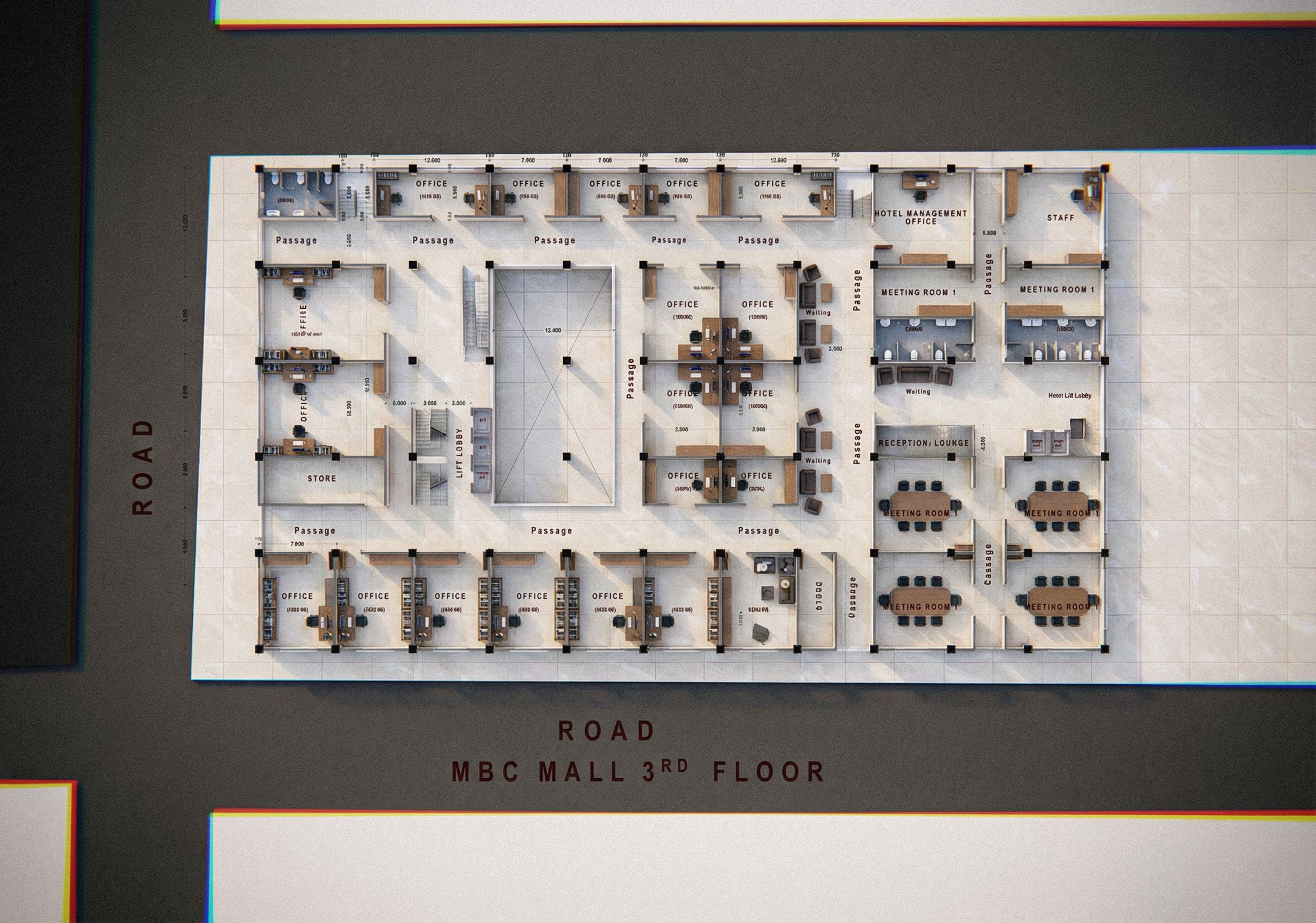 PromptLAYOUT SHOWING MEETING ROOMS, OFFICES AND WAITITNG AREAS. USE CERAMIC TILES AS FLOOR FINISH. CLEARLY INDICATE THE WASHROOMS AND ANNOTATIONS. MAKE LAYOUT REALISTIC AND HIGH RESOLUTION. MAKE LAYOUT REALISTIC AND HIGH RESOLUTION., keep exact camera angle