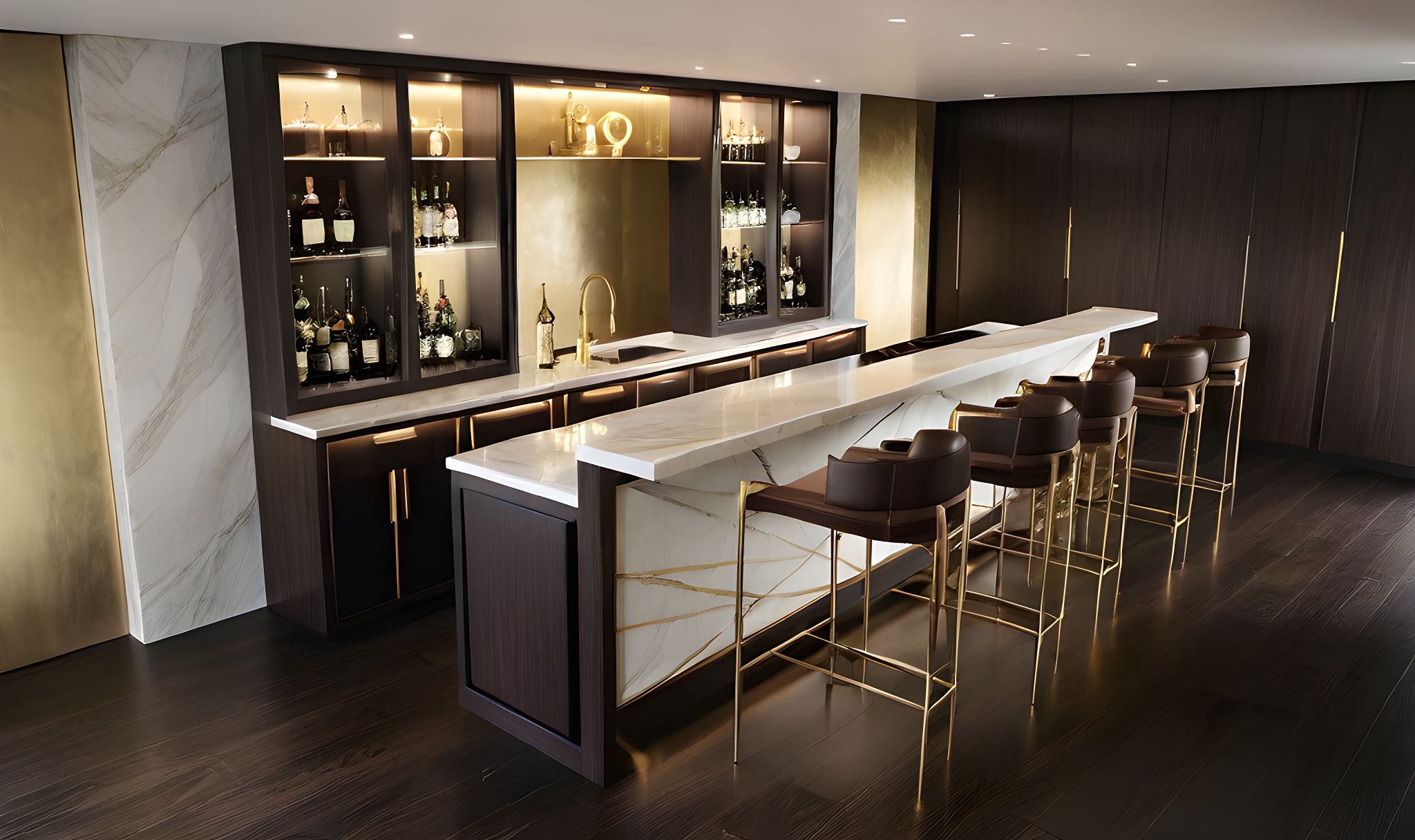 PromptBAR, WHITE STONE, MIRROR BACK, CHOCOLATE WOOD, APLIANCES STIL COLORMODERN LIGTHS,CABINETES DOOR CHOCOLATE WOOD, WALLS WHITE PLANE,SEELING WHITE, TAP BAR WHITE STONE , FACE FRONT BAR LEATHER WHIT GOLD FACE LATERAL BAR WOOD CHOCOLATE, FRAME BAR WOOD CHOCOLATE,ALL FRAME AND DIVISION CHOCOLATE,WALLS WHITE PAIN