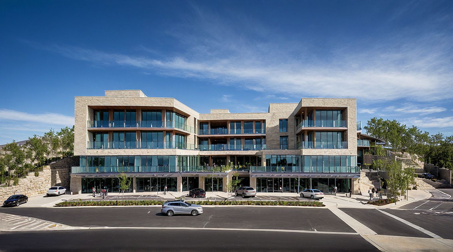 Photo of a contemporary mix-use Food & Beverage building with layered balconies and expansive glass walls. Emphasize sleek travertine stone facade, sleek railings, and vibrant greenery at the entrances. Set in an urban context with nearby pedestrian activity and vehicles in the foreground and on the right with steep slope street. Soft afternoon light casts natural highlights, accentuating structural forms. with partly cloudy skies. Captured from a low angle, utilizing a wide-angle lens to enhance depth and provide a dynamic perspective of the architectural features. Add cars, people, and outdoor furniture