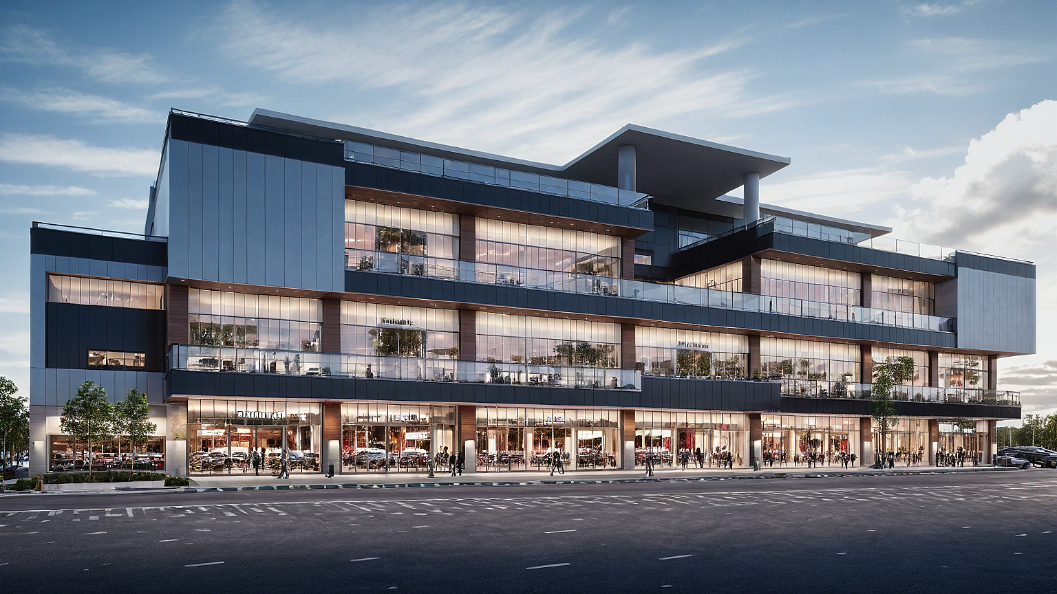 Promptshopping mall, cars, trees, people, realistic rendering, modern facade, realistic sky, parked cars, lighting on the facade, small trees in front of the building, people walking, cars passing by