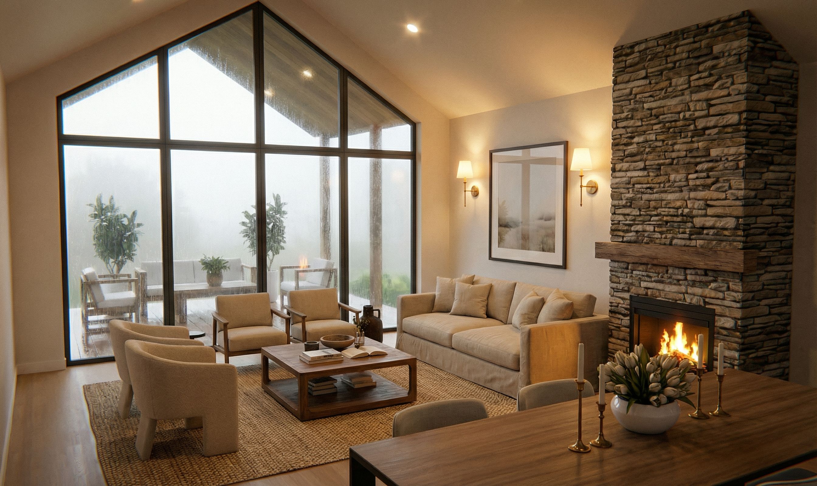 CREATE A BEAUTIFUL COZY LINEN ROOM, CHANGE THE FUREPLACE STONE TO REAL STONE, MATCH THE ART AND LIGHTS AND FURNITURE IN THE REFERENCE PHOTO, keep exact camera angle