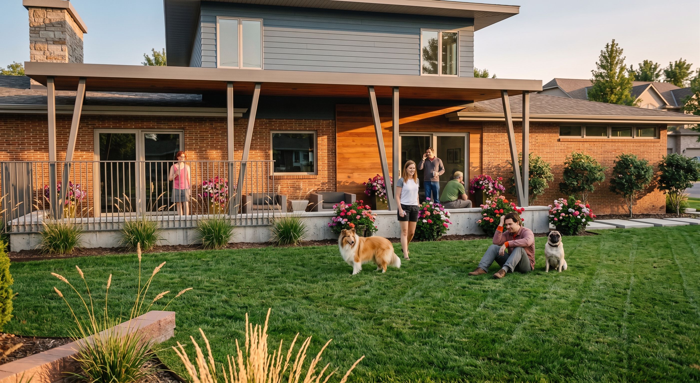 PromptPhoto of a modern two-story residential home featuring a blend of brick and wood materials, highlighted by large glass windows. The design incorporates a spacious front porch with distinctive support beams and landscaped gardens adorned with colorful flowers. Set in a suburban environment, the scene includes lush green lawns and neighboring homes. Captured in afternoon light, the warm glow enhances the structure's textures and casts gentle shadows. Perspective from a low angle with a wide lens creates an inviting atmosphere, showcasing both architectural elegance and a vibrant outdoor setting., keep exact camera angle