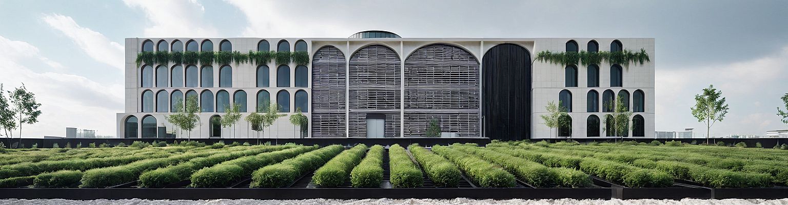 PromptHospital building made with pure white travertine having curtain wall on facade some part of curtain wall covered with black steel louvres and atrium dome on roof for natural light. Green terraces