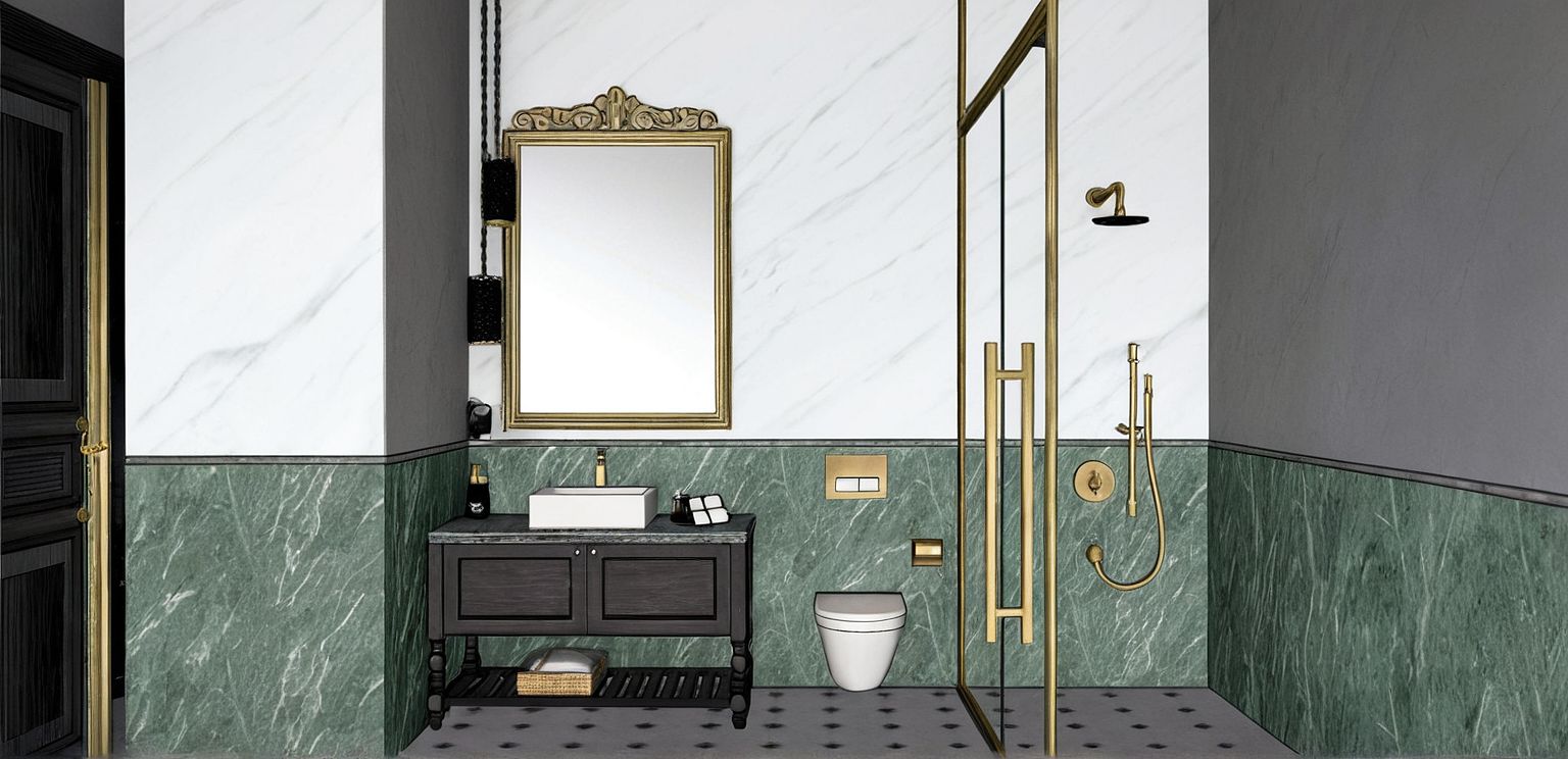 PromptLuxury interior of toilet with baroda green granite and white marble of big size. The bathroom fittings are antique gold finish. Add brass molding to separate the two different color stone walls. Add a black and white tile flooring.