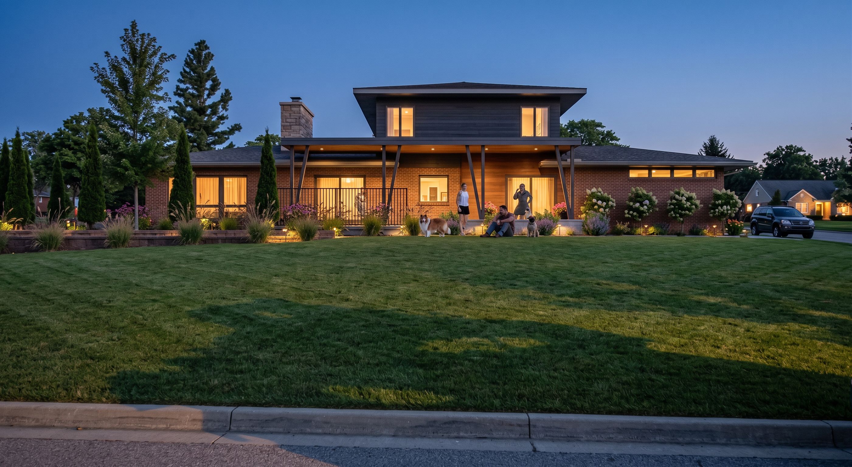 PromptPhoto of a modern two-story residential home featuring a blend of brick and wood materials, highlighted by large glass windows. The design incorporates a spacious front porch with distinctive support beams and landscaped gardens adorned with colorful flowers. Set in a suburban environment, the scene includes lush green lawns and neighboring homes. Captured in afternoon light, the warm glow enhances the structure's textures and casts gentle shadows. Perspective from a low angle with a wide lens creates an inviting atmosphere, showcasing both architectural elegance and a vibrant outdoor setting., keep exact camera angle