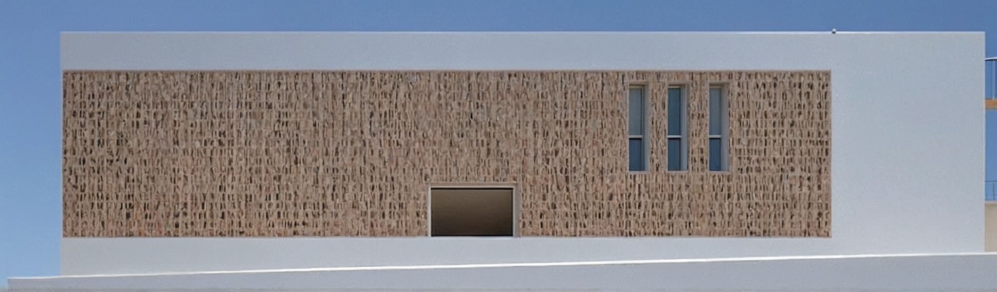 PromptFachada principal de un colegio. Un volumen prismático minimalista. La parte maciza de la fachada es de mortero color blanco roto con una celosia de terracota situada delante de las ventanas. Los huecos son de vidrio. El dia es soleado y el cielo esta azul