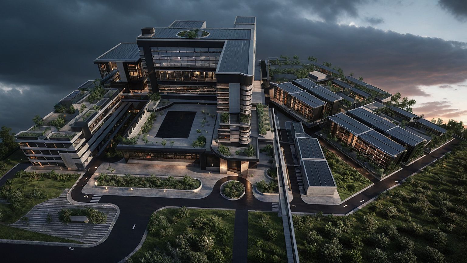 Photorealistic + heavy overcast with rain + late evening sunset + modern + vegetation and shrubs + building facade to be industrial geometric modern architecture + steel black and concrete building finish + maintain sky rail + no water