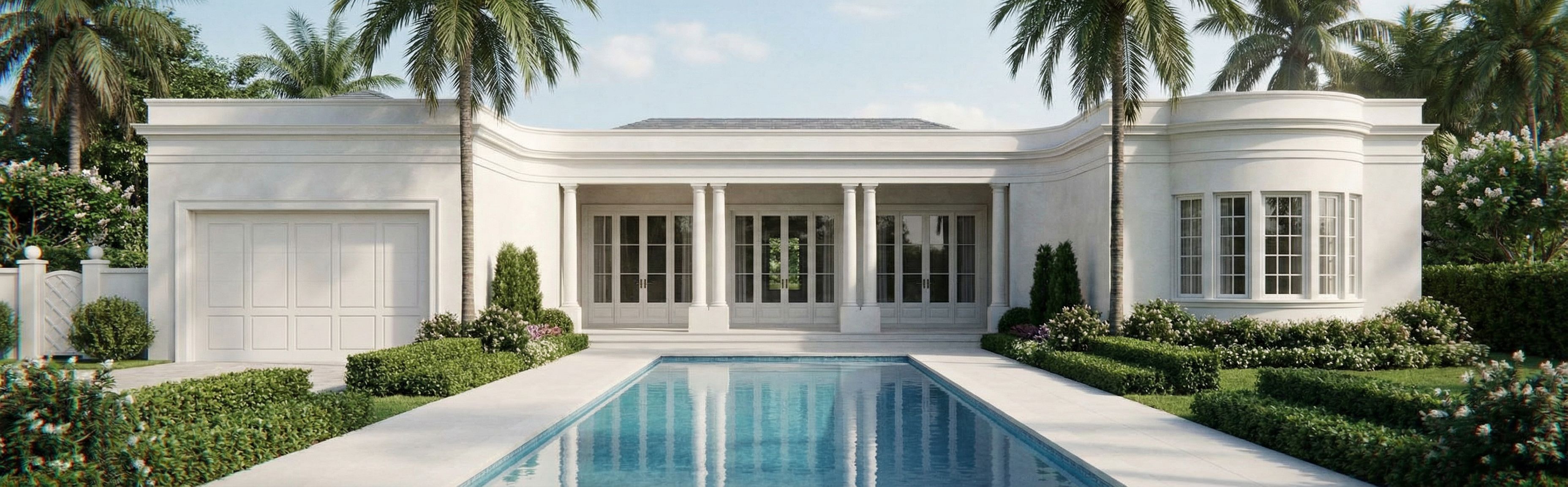 Exterior material is smooth white stucco with subtle natural variation and realistic surface texture. crisp and refined with clean profiles and delicate shadow lines. There should be a natural subtle variation between the colors of white in the architectural elements as you would find in real life.