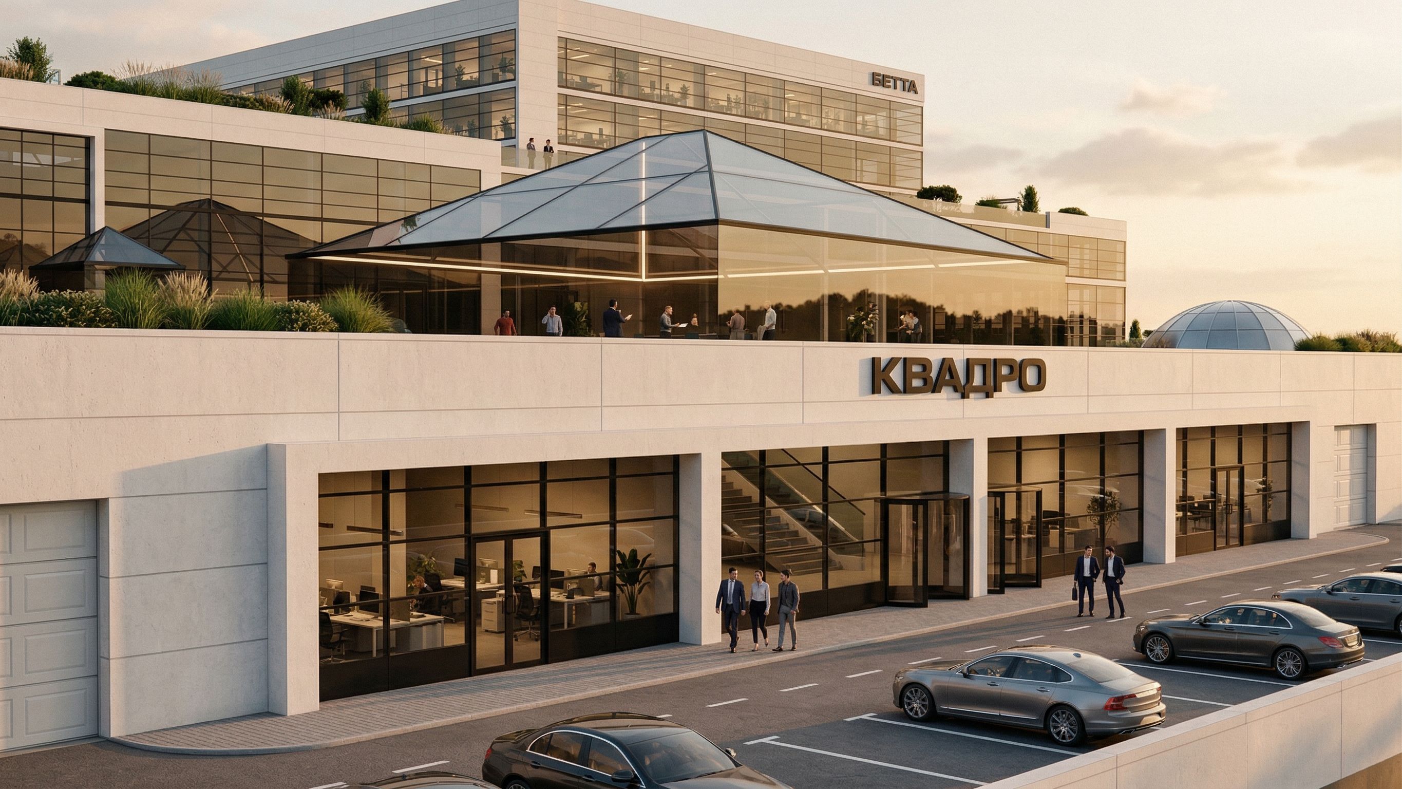 PromptФотография современного ПРОИЗВОДСТВЕННО-офисного комплекса. Отделка фасадов элегантными стеклянными тонированными витражами и белыми сендвич панелями. Здание на рельефном ландшафте. Проект включает в себя многоуровневую планировку. На кровле зенитные фонари из тонированного стекла. через которые попадает свет внуть здания. Люди неспешно идут на работу. Автомобили бизнес класса паркуются на открытой парковке. Теплое освещение в дневное время отбрасывает мягкие тени и усиливает текстуру материалов и подчеркивая линии здания. Фотография с человеческого роста. Сохрани точный ракурс камеры., keep exact camera angle