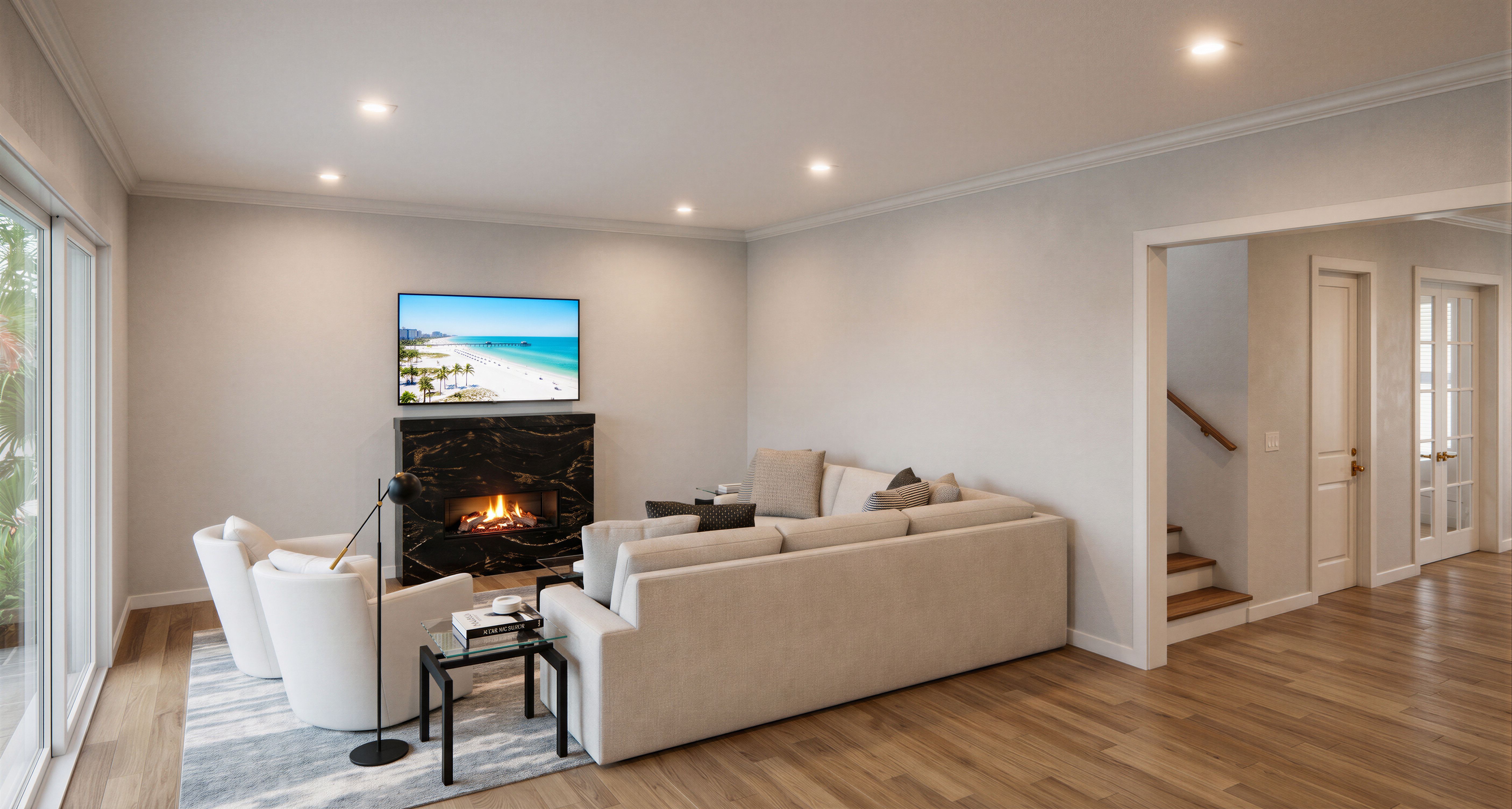 Make photo-realistic rendering of the living room; Light fixtures on, bright room; TV is showing a scene from a beach in Tampa, Florida, keep exact camera angle