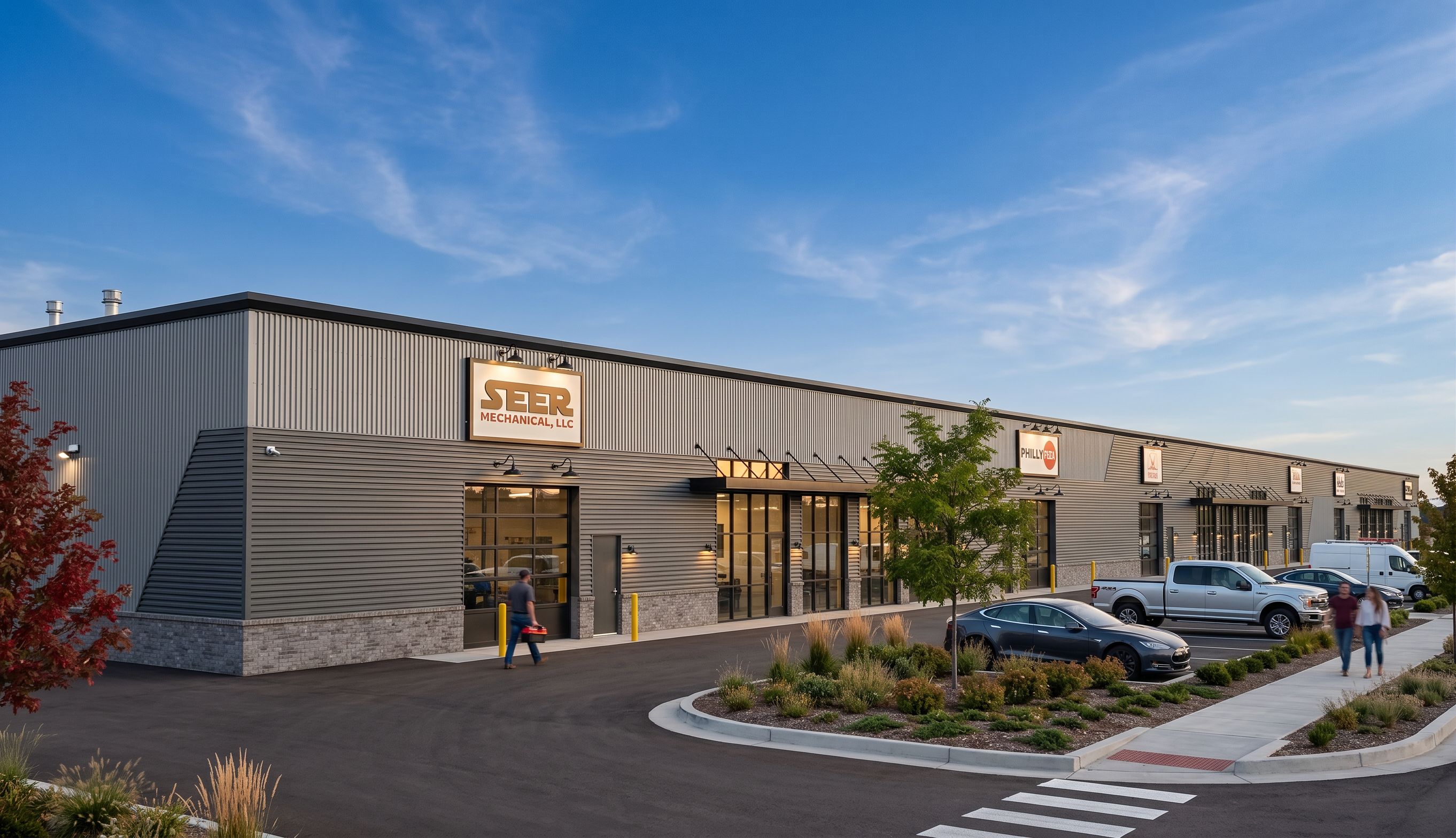make this image more polished and realistic. the sky should be blue. add cars and people and planting. exterior facade is metal panel. gray masonry at the base of the walls. Coping should be black. It should look slick and impressive., keep exact camera angle