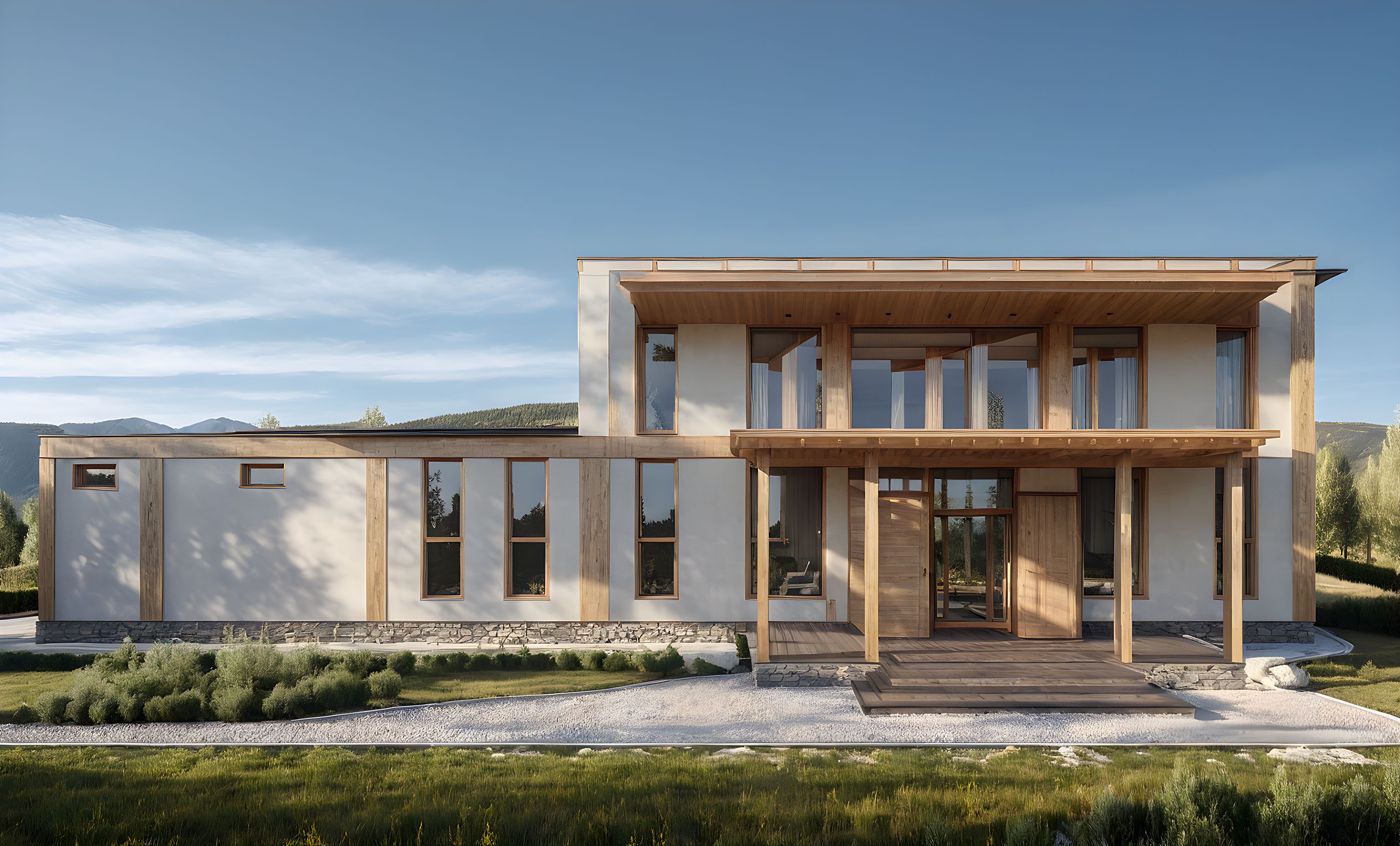 Promptsoft sun on a clear day with a facade consisting of thermo oak wood and beige plaster walls in a mountain backdrop surrounded by poplar, willow and juniper trees