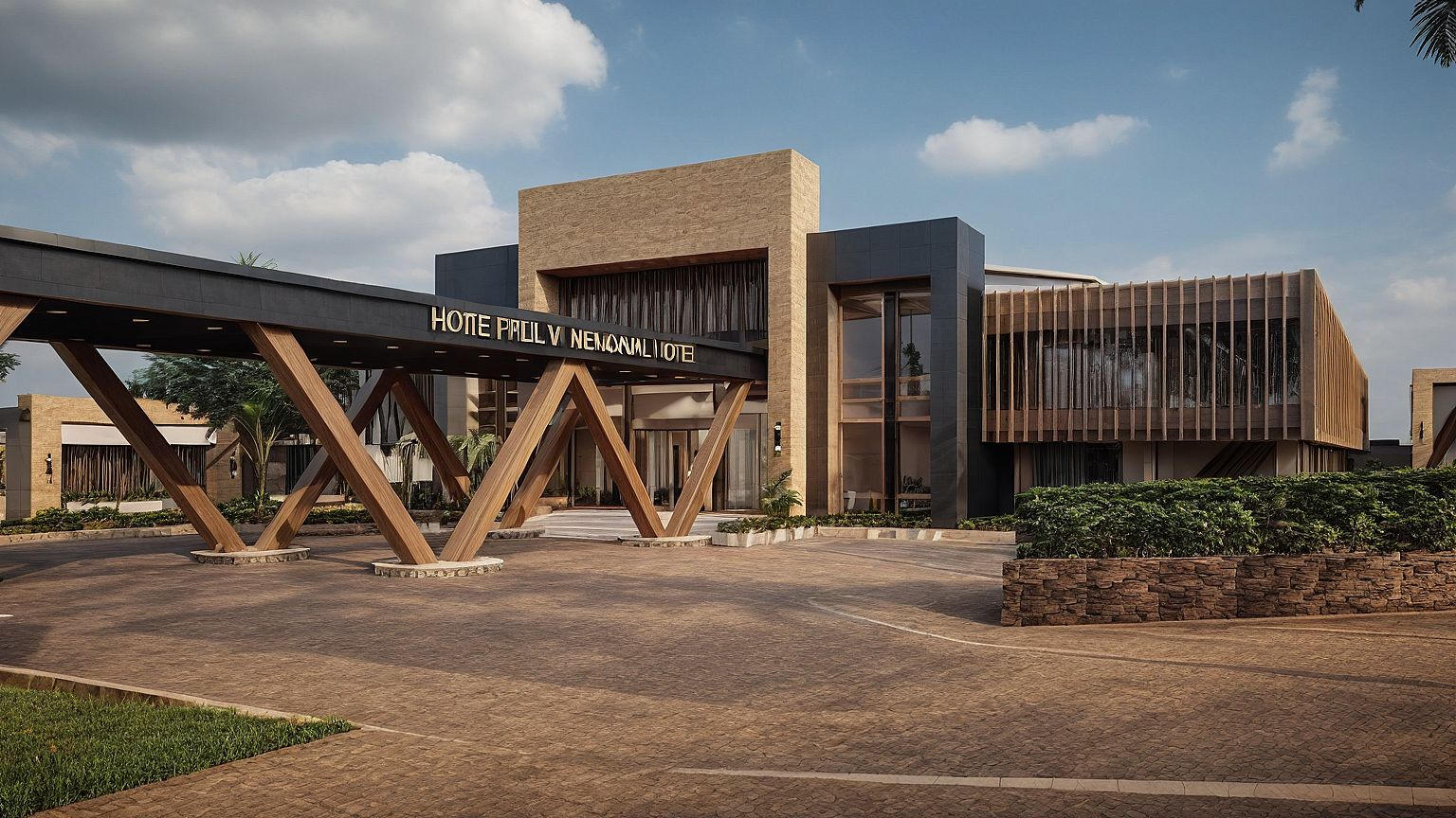 create a high-end image, very tidy around of this new hotel in Kampala context. maintain the image angle. place some people in the context