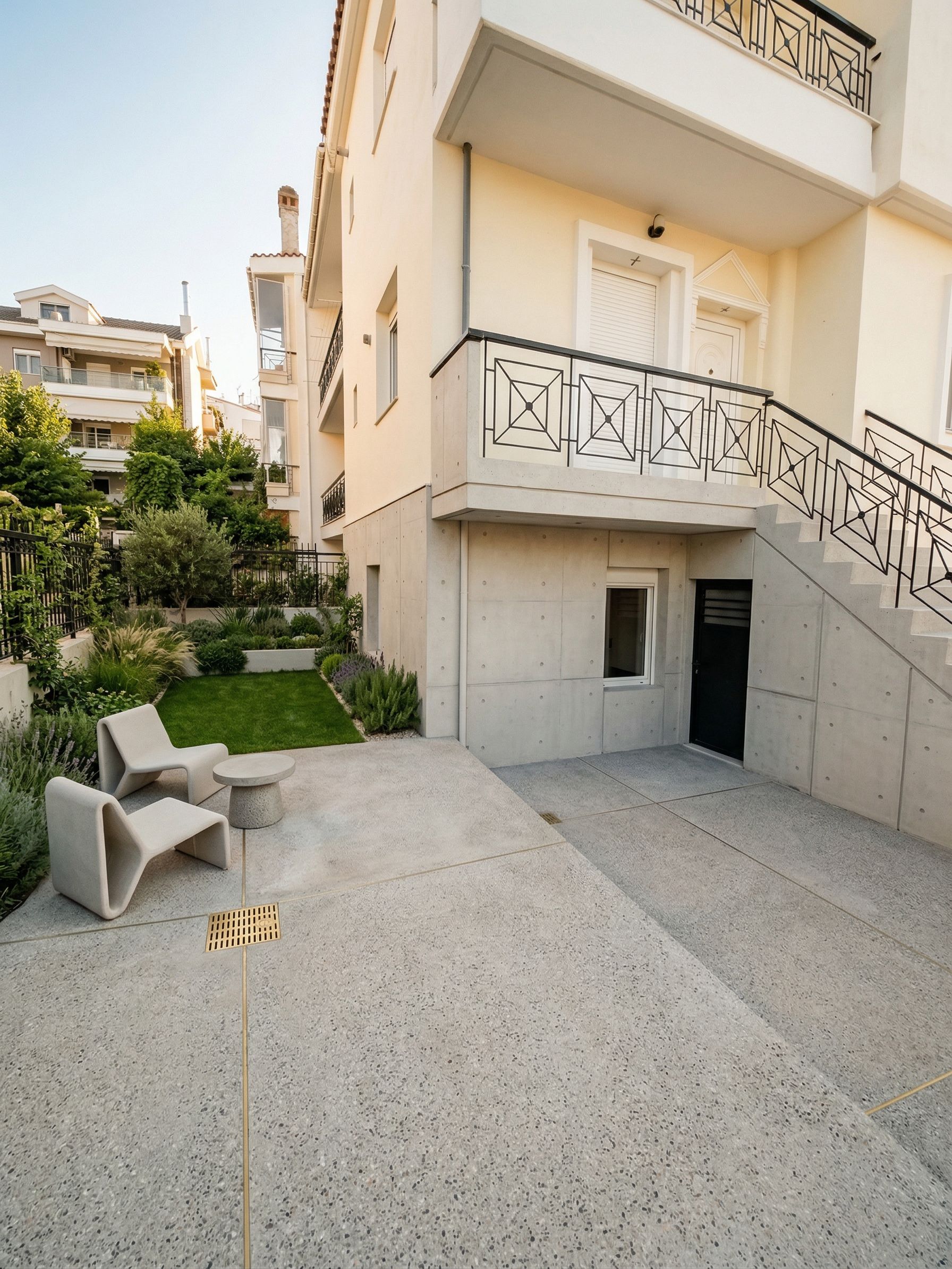Promptcreate a beautiful exterior garden with furniture and grass. , keep exact camera angle , remove stone and put concrete, replace the marble with beautiful concrete, keep exact camera angle