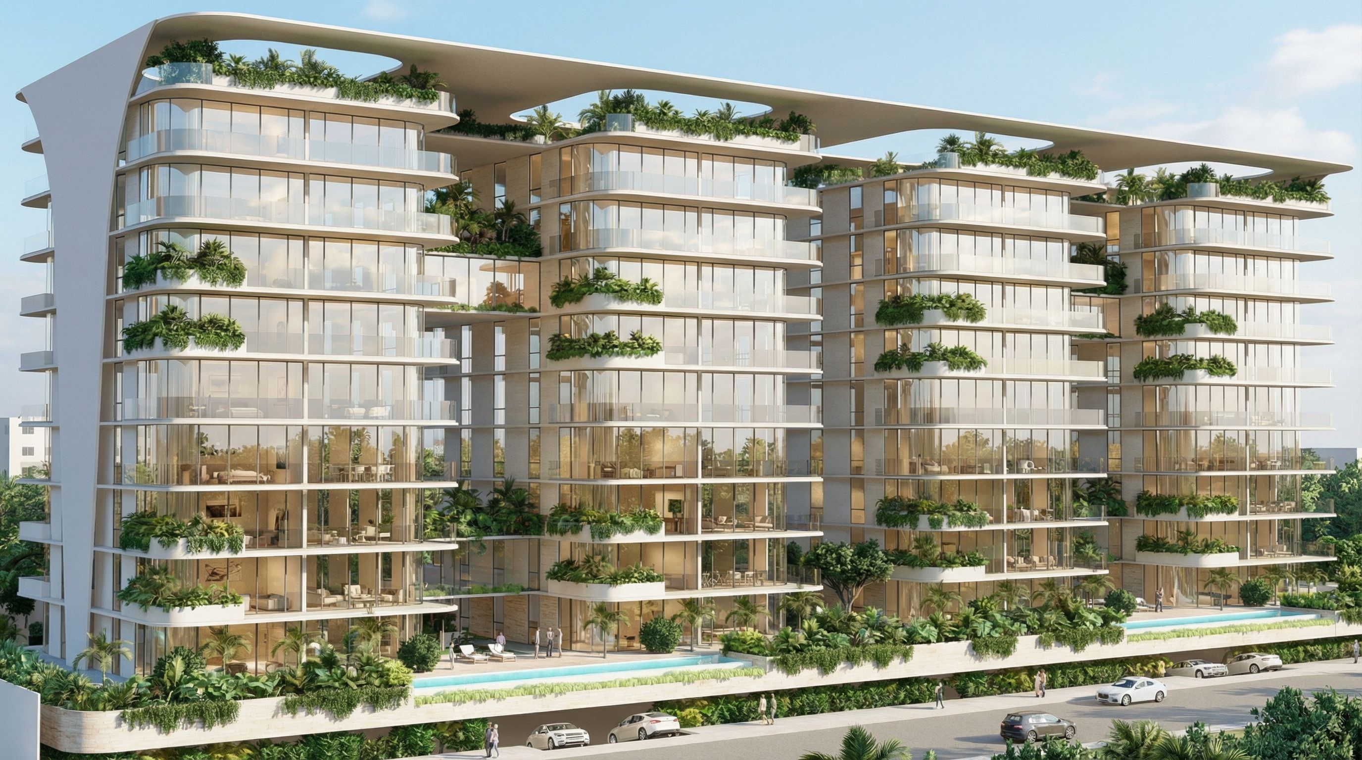 architectural exterior rendering, render this 3D mass into photorealistic rendering, Improve the realistic details, the beautiful sky, and the reaistic glass, iluminated on the interior. Photo of a modern residential apartment complex, featuring curved glass facades and extensive greenery on terraces. Architectural elements include sleek lines, light-colored materials, and expansive windows enhancing natural light. Set in an urban environment with nearby lush landscapes and minimalistic nearby buildings. Bright, soft daylight illuminates the structure, casting gentle shadows that enhance its contours. Captured from a low angle for an impressive perspective, using a wide-angle lens to encompass the full breadth of the building and its surroundings., keep exact camera angle, bright daylight, natural lighting, including people, vehicles, greenery and vegetation, trees, high quality, professional, detailed scene