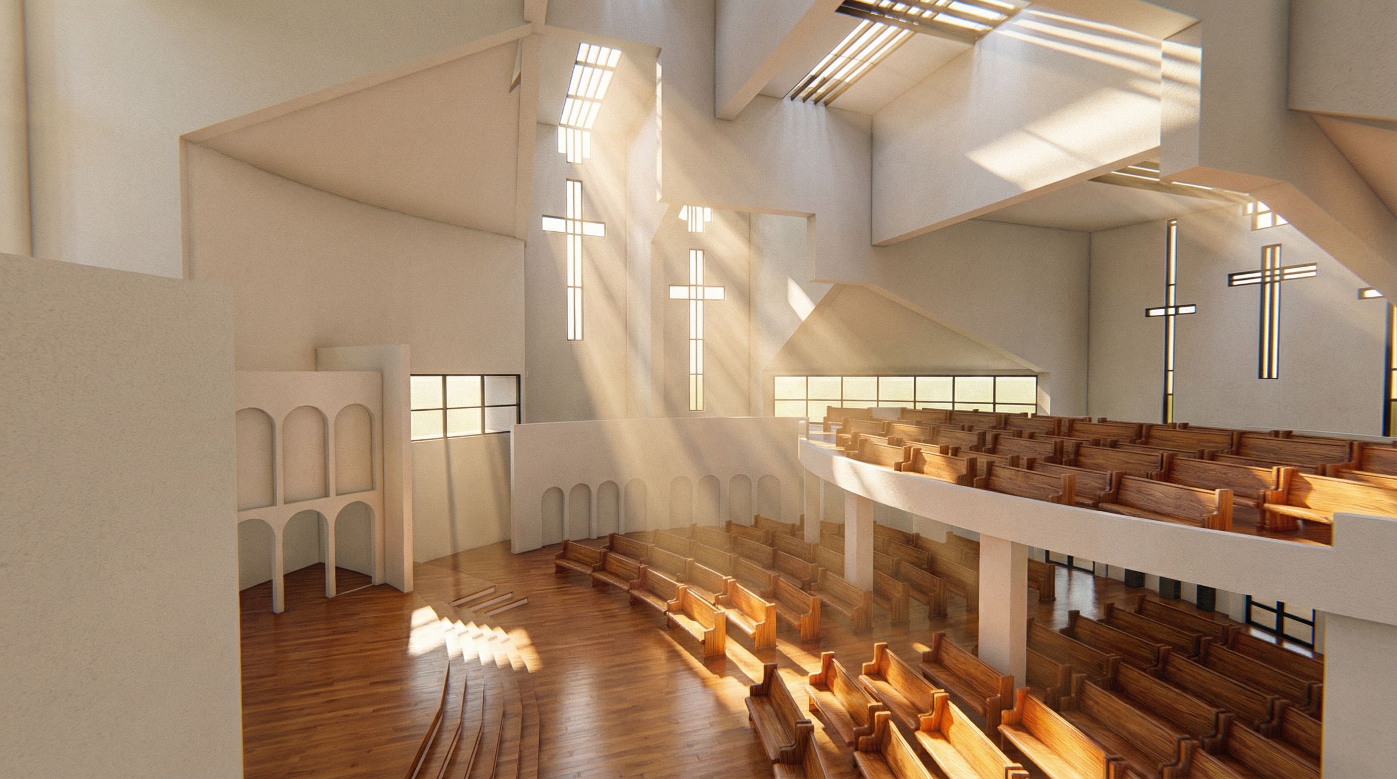 Promptthis is a scene of a church from the inside.. i want you to enhance the material and change the bricks into painted smoothed off-white and make it more realistic and the wood of the chairs must look real and new and enhance the lighting of the sun and edit the modelling problems without changing the design don't add artificial lights or lamps or linear just sun rays change the material of the black stone to wood, keep exact camera angle