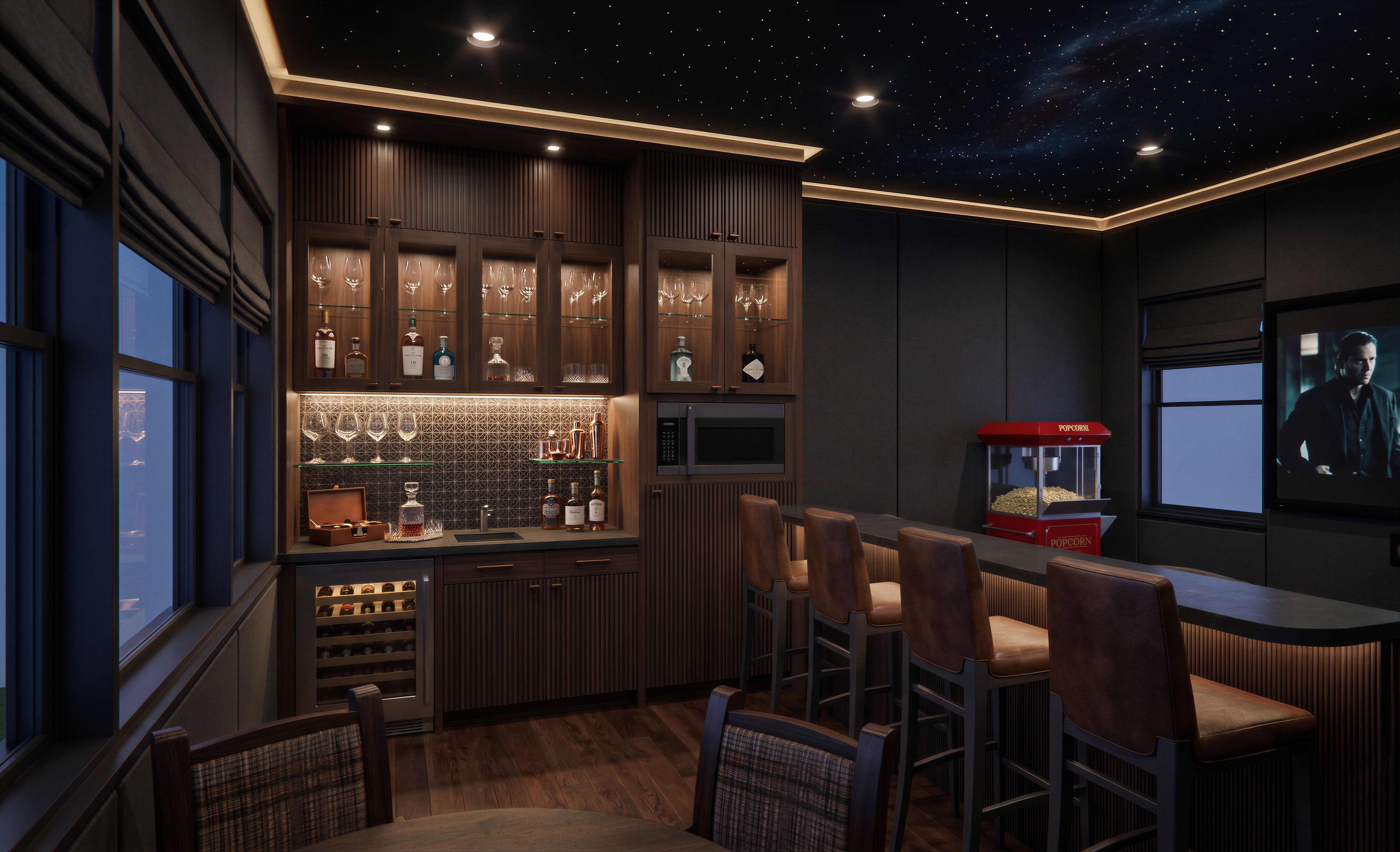 Make photo-realistic rendering of this media room; Add wall design as appropriate for a media room and trending now; Add night sky ceiling design as appropriate for a media room and trending now; Add colors as is a trend now for a media room; Picture right of the back window is a projection screen; Add light fixtures as appropriate, light fixtures on; Add appropriate items to the current wet bar cabinets; There is more glassware than bottles in the glass door cabinets, Glassware on glass shelves above the countertop; There is a popcorn machine next to the existing window; Windows have blinds as appropriate for a media room; Only skies are seen through the windows; Keep existing windows; No extra windows; No extra openings;, keep exact camera angle