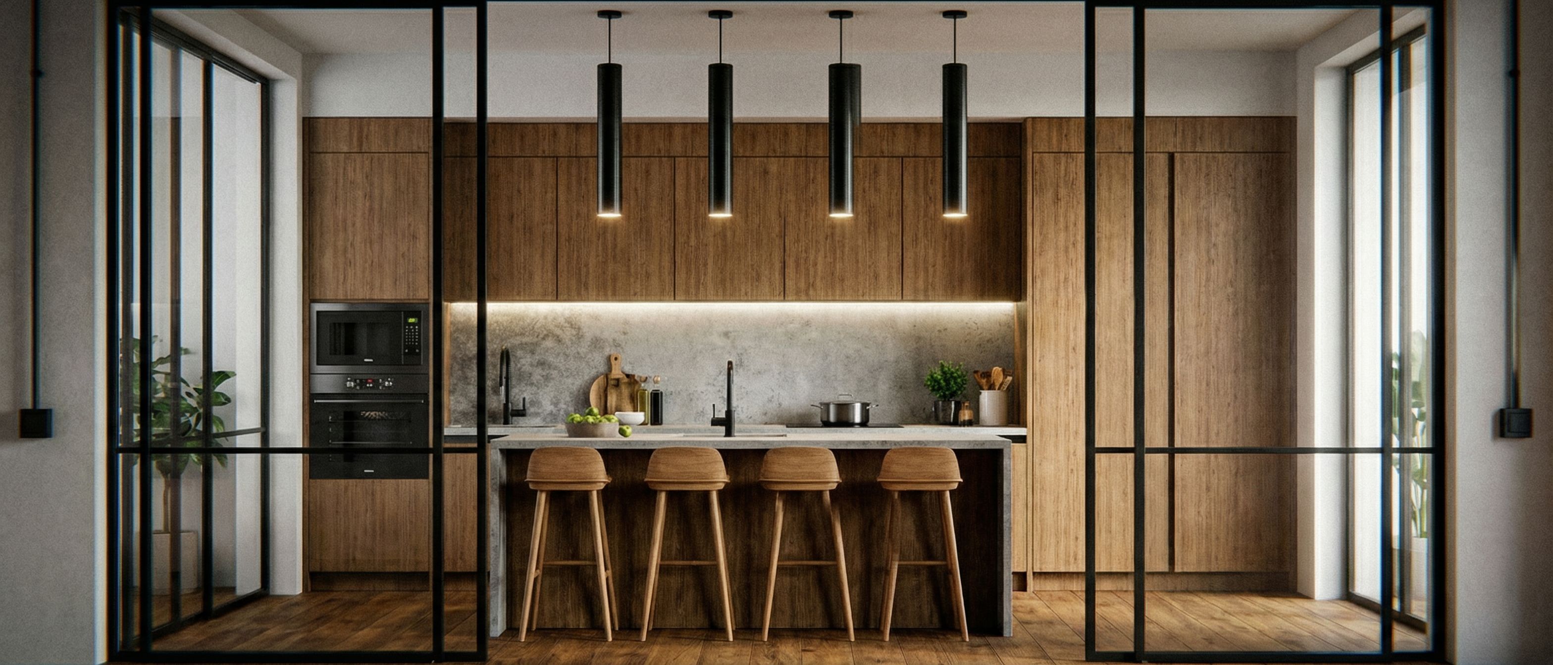 ESTETICA INDUSTRIAL COCINA ROBLE SUELO MADERA MEDIO PERFILERIA DE EMTAL NEGRO Y PANELES DE VIDRIO , keep exact camera angle, luminarias cilindiricas alargadas, keep exact camera angle