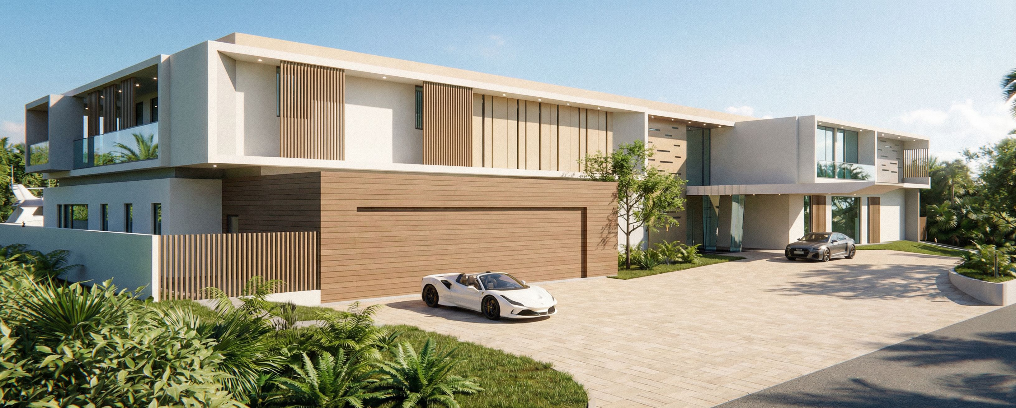 render hiper realista. vidrios low e clear reflective. colocar mini leds en los techos exteriores. vegetacion tipica de la florida. no usar arboles en la fachada que tapen la fachada, ni tampoco arboles altos en el jardin de elfrente. las placas rojas del segundo piso cambiarlas por un tono beige clarito. el adoquin del dryway en un tono mas clarito. cambiar el color del ferrari por un color blanco y el del audi por un color metalico gris., keep exact camera angle