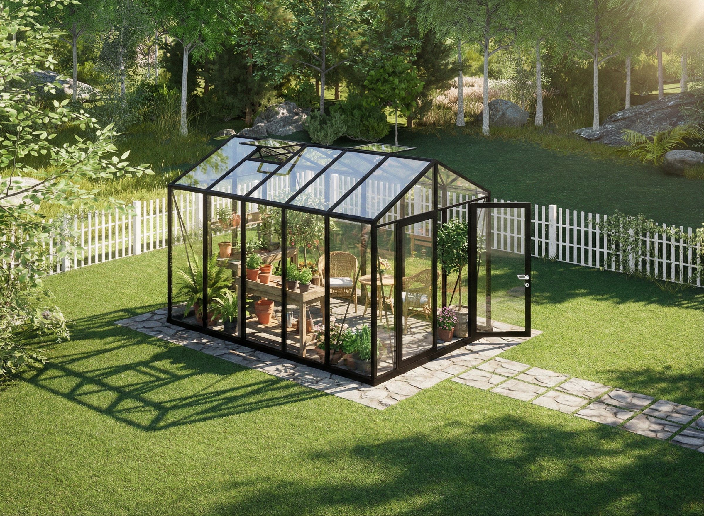 PromptMake more realistic. better lighting and shadows and plants. Change furniture and plants inside, keep exact camera angle